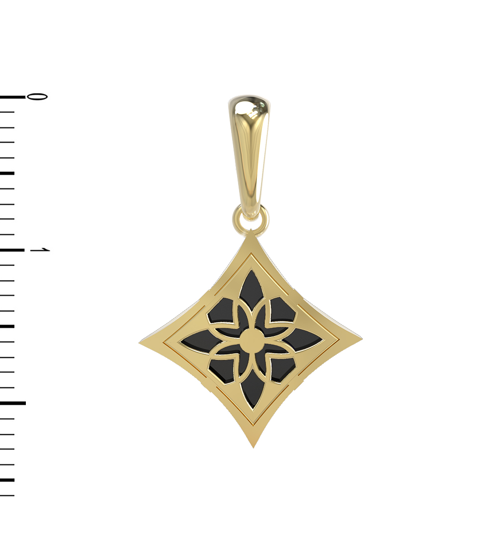 Подвеска из лимонного золота 585 пробы — это изысканное сочетание благородного металла и глубокого, насыщенного цвета. Аксессуар выполнен в дизайне клевер, который давно стал символом элегантности и удачи, дополняя ваш образ нотками стиля и уверенности. Центральным элементом украшения выступает вставка из оникса черного цвета, имеющая эффектную форму ромба. Одна вставка идеально вписана в золотую основу, создавая гармоничный контраст между теплым оттенком лимонного золота и строгим темным камнем.