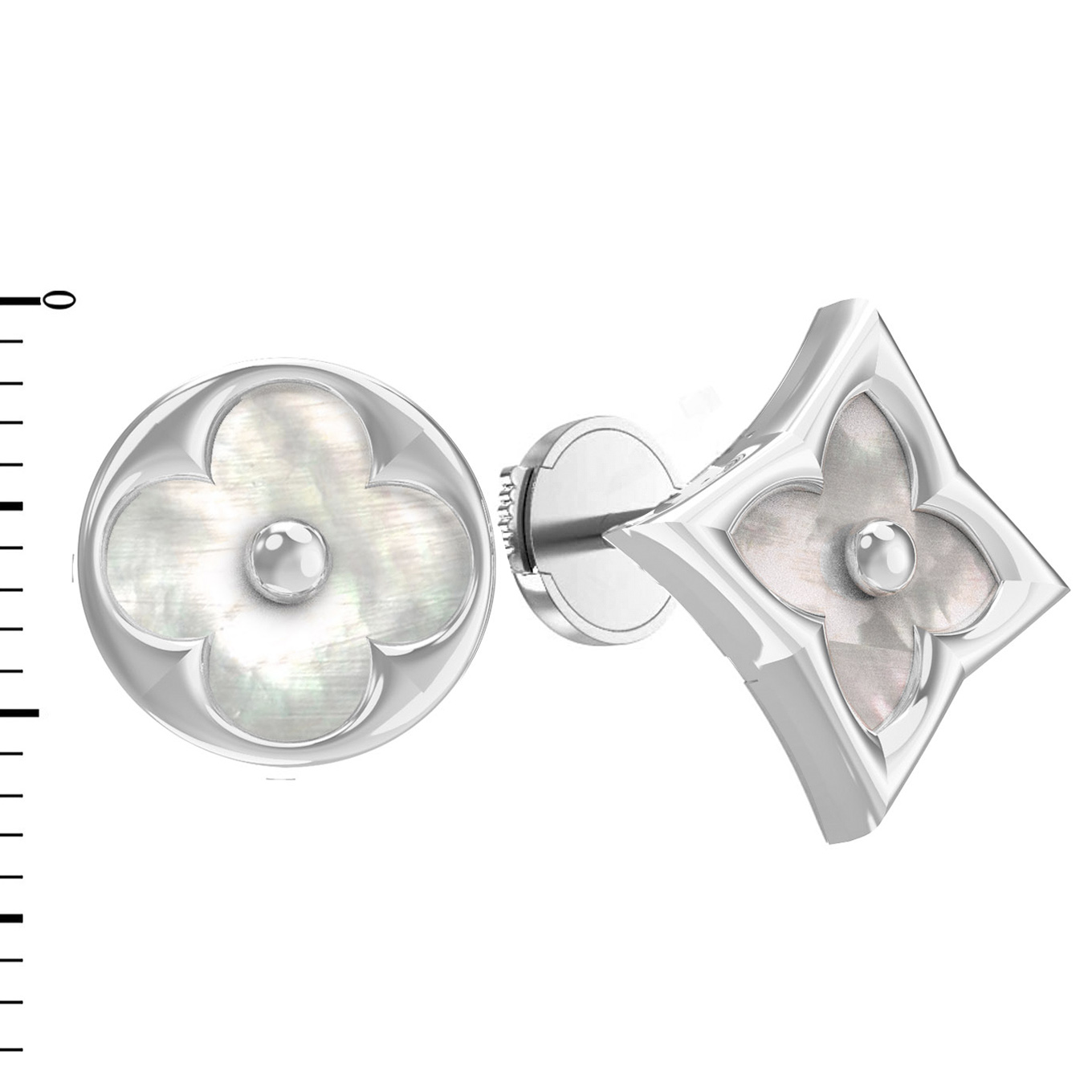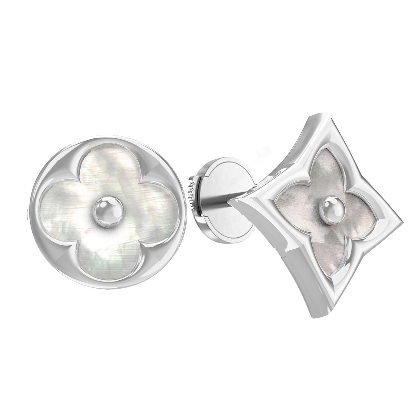 В центре композиции расположен нежный перламутр, который переливается мягким жемчужным сиянием. Геометрия вставок продумана до мелочей: сочетание форм круга и ромба создает гармоничный и сбалансированный вид, который привлекает внимание своей изысканностью. Белый цвет металла идеально сочетается с перламутровыми вставками, подчеркивая их природную красоту.