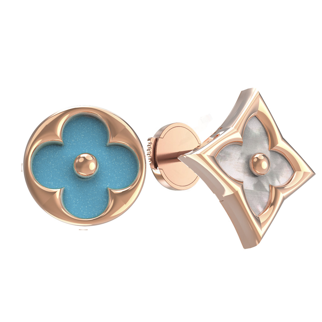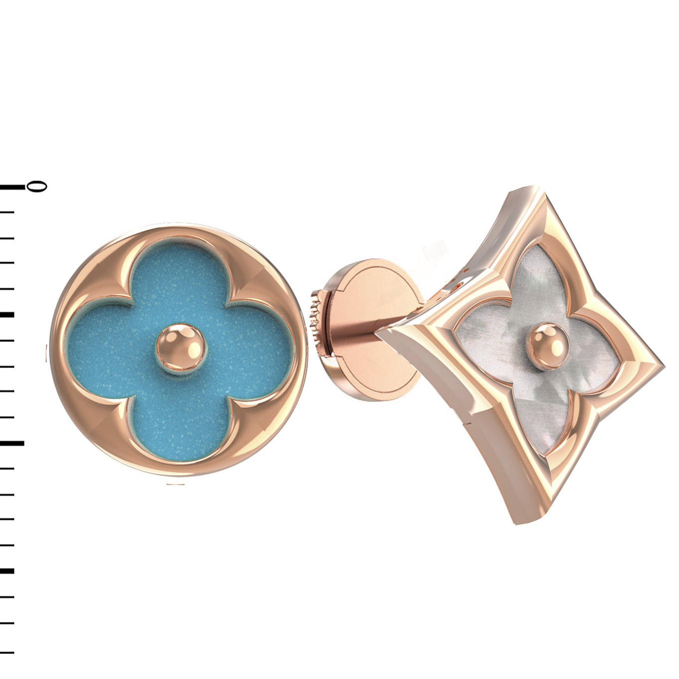 Серьги отличаются необычным сочетанием материалов: вставки из бирюзы бирюзового цвета и перламутра создают гармоничный контраст, притягивающий взгляд. Разная форма вставок — круг и ромб — подчеркивает уникальность исполнения и современный подход к классическим ювелирным традициям. Каждая вставка дополнена аккуратным золотым элементом в центре, что завершает художественную композицию.