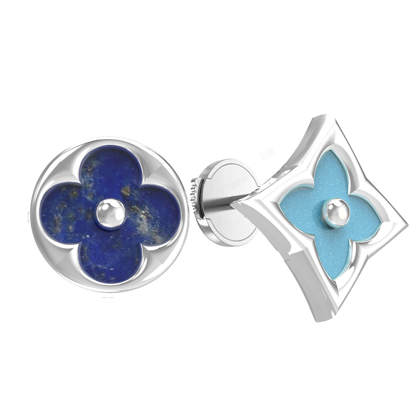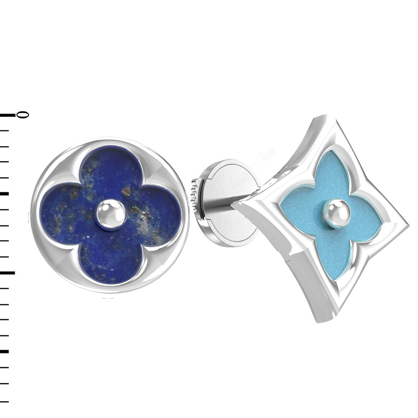Ключевая особенность этих серег — искусное сочетание вставок. Одна серьга инкрустирована лазуритом глубокого синего цвета в форме круга, другая — яркой бирюзой в форме ромба. Такое асимметричное решение делает аксессуар необычным и запоминающимся. В общей сложности в изделии использованы 2 вставки, которые подчеркивают выразительность и глубину природных минералов.