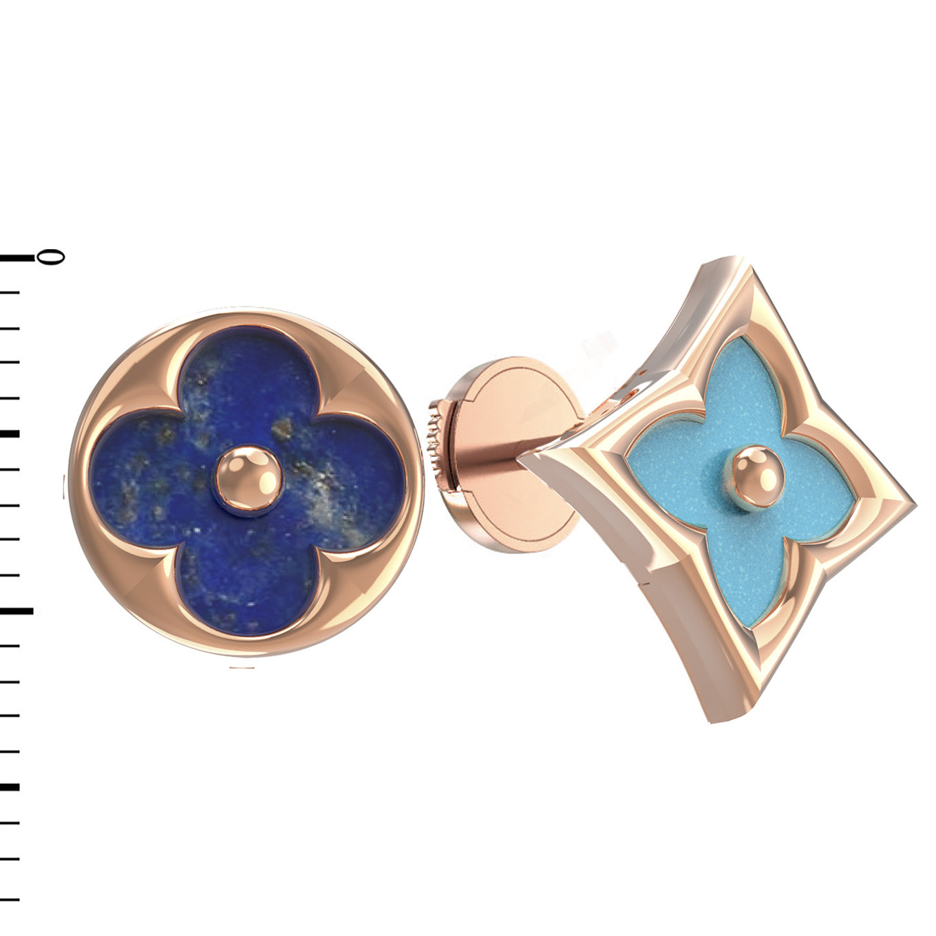 Серьги выполнены из благородного красного золота 585 пробы. Глубокий, насыщенный цвет драгоценного металла эффектно подчеркивает яркость вставок. В данной модели использовано сочетание двух контрастных камней: бирюзы бирюзового цвета и лазурита глубокого синего оттенка. Контраст между теплым золотым блеском и холодными природными тонами создает выразительный визуальный эффект. Камни имеют необычную геометрию: одна вставка выполнена в форме круга, вторая — в форме ромба, что вносит элемент асимметрии и оригинальности в дизайн.