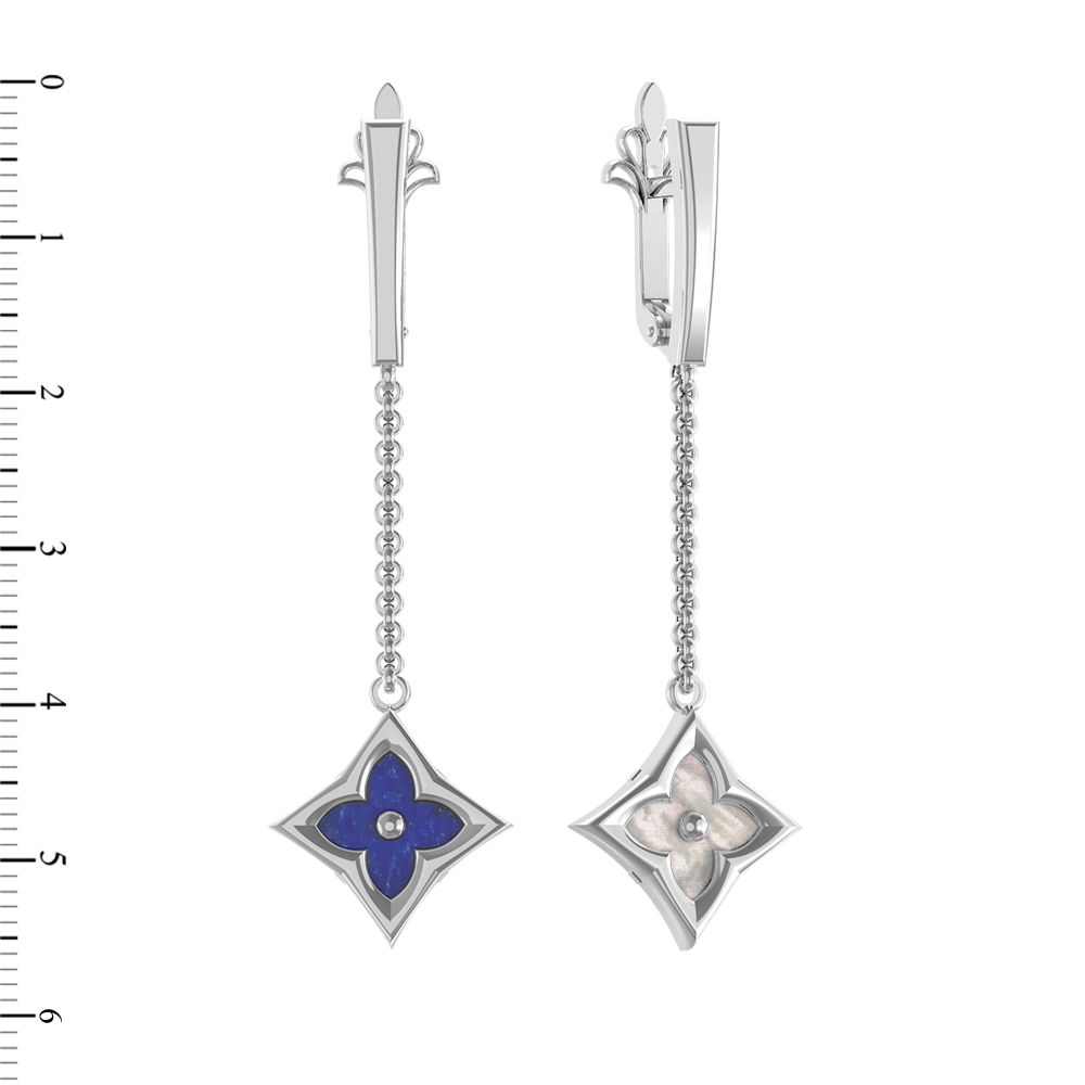Особую выразительность украшению придает форма вставок: каждый декоративный элемент выполнен в виде ромба. Контрастное сочетание материалов подчеркивает оригинальность задумки: в одной серьге используется насыщенный синий лазурит, а в другой — нежный перламутр. Холодный оттенок белого золота идеально дополняет естественную эстетику этих вставок.