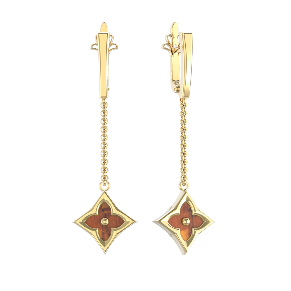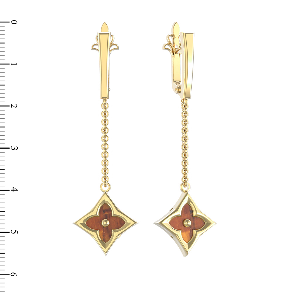 Конструкция серег продумана так, чтобы подчеркнуть динамику и блеск материала. Две вставки из тигрового глаза закреплены на элегантных подвесах, которые мягко покачиваются при движении, привлекая внимание к лицу. Это универсальный аксессуар, который подойдет как для женщин, так и для мужчин, предпочитающих лаконичные и статусные украшения. Лимонный оттенок золота добавляет теплоты, идеально гармонируя с глубокими оранжевыми переливами натурального камня. Данное изделие отлично сочетается с другими украшениями бренда, позволяя легко создавать полноценные комплекты.
