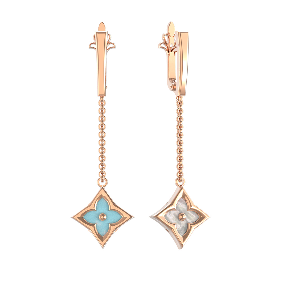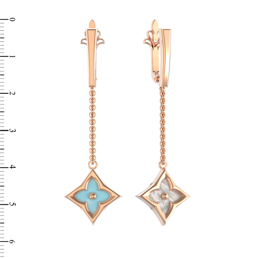 Изящные серьги из красного золота 585 пробы станут воплощением утонченного стиля в вашем образе. Дизайн украшения, вдохновленный классическим мотивом клевера, подчеркивает статус и безупречный вкус обладателя. В качестве центрального акцента выступают выразительные вставки в форме ромба: одна серьга декорирована бирюзой небесно-голубого цвета, вторая — нежным перламутром с его уникальным естественным сиянием. Гармоничное сочетание теплых оттенков металла и благородных минералов делает изделие по-настоящему особенным.