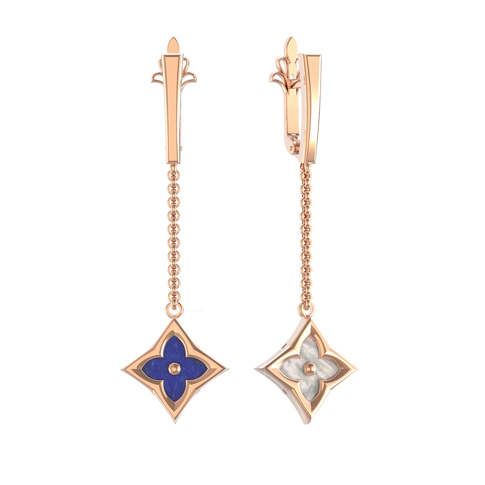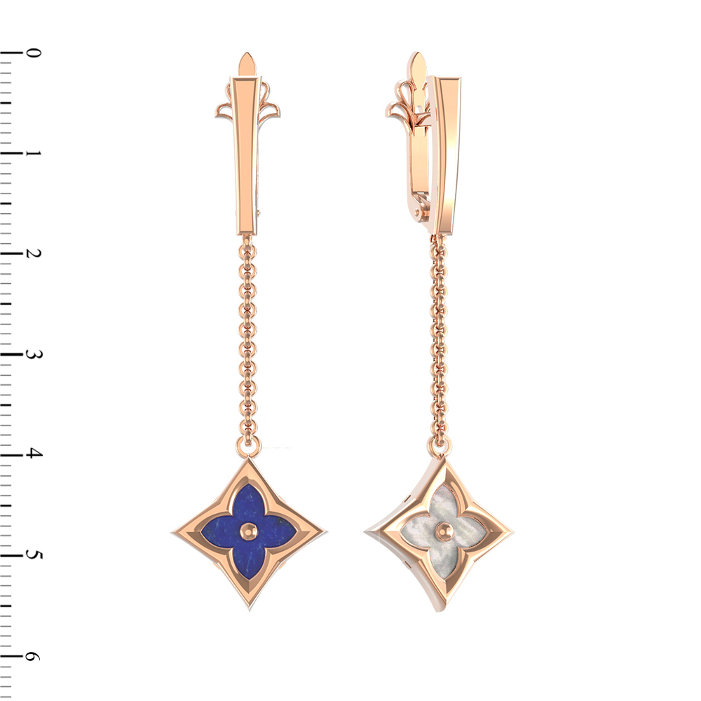 Центральным акцентом композиции является вставка в форме ромба, внутри которой деликатно расположился узнаваемый мотив клевера. В данных серьгах гармонично сочетаются контрастные оттенки вставок: глубокий синий цвет лазурита и нежное сияние перламутра. Красный металл оправы эффектно обрамляет природные камни, превращая изделие в стильный аксессуар, который притягивает взгляды. Благодаря продуманной форме и элегантному исполнению, серьги из красного золота отлично дополнят как повседневный образ, так и вечерний наряд.