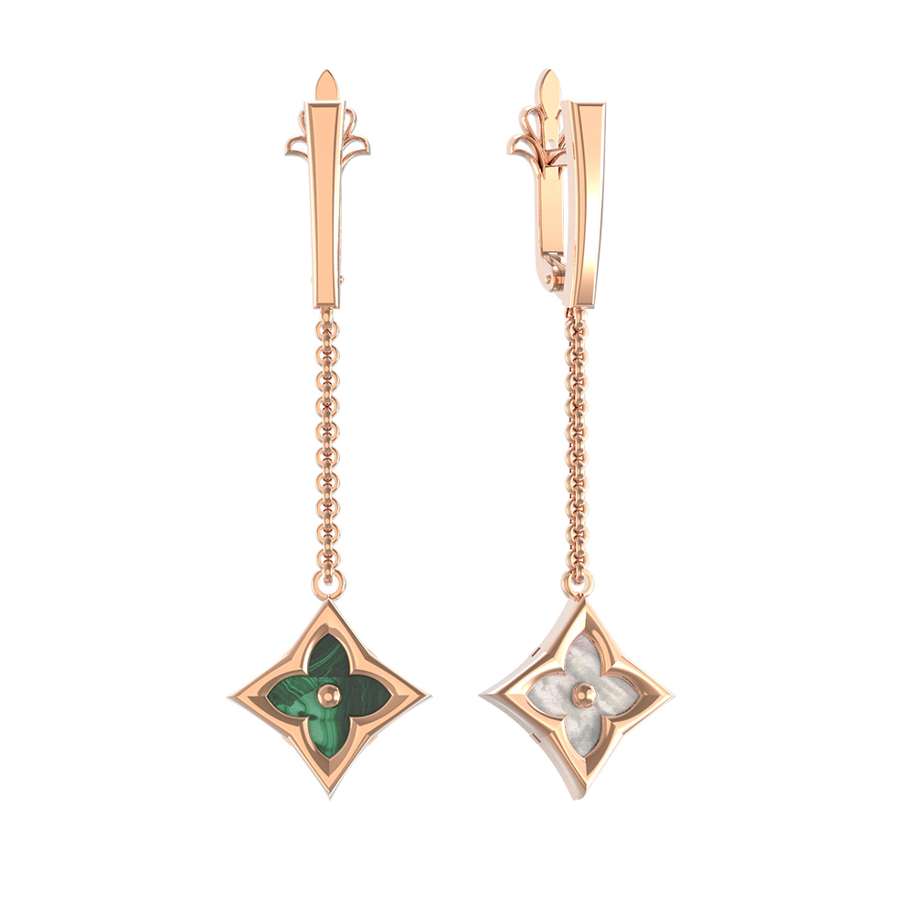 В центре композиции расположены контрастные вставки: одна серьга украшена малахитом глубокого зеленого цвета, вторая — перламутром с нежным переливом. Каждая вставка имеет форму ромба и надежно закреплена в золотой оправе, создавая эффектный акцент. Дизайнерское решение в виде клевера придает изделию особое очарование и символичность. Конструкция серег, дополненная подвижной цепочкой, обеспечивает легкость и динамичность при движении.