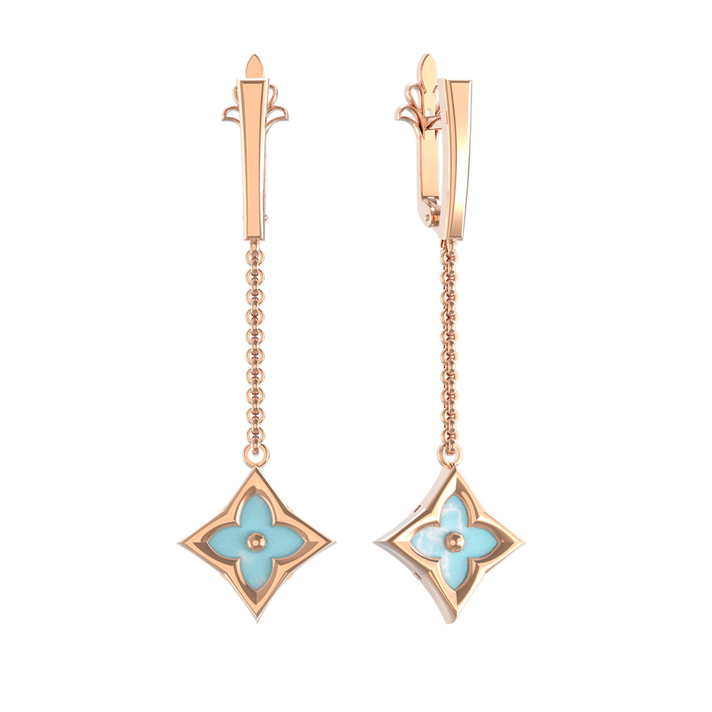 Эти серьги из красного золота с бирюзой могут быть приобретены отдельно или в составе гармоничного комплекта, что позволит создать завершенный ювелирный ансамбль. Уникальный дизайн клевер подчеркнет вашу индивидуальность и безупречный вкус, делая это украшение достойным выбором для любого случая.