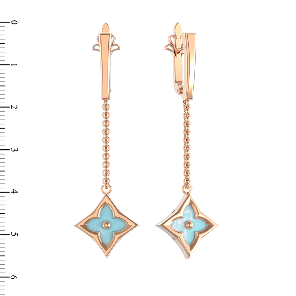 Центральным акцентом композиции выступают две вставки из натуральной бирюзы. Нежный бирюзовый цвет камней гармонично контрастирует с теплым блеском красного металла. Вставки имеют классическую форму ромба, что подчеркивает геометричность и архитектурную строгость украшения. Качественное исполнение и выверенные пропорции делают эти серьги универсальным аксессуаром, подходящим как для женщин, так и для мужчин, которые ценят лаконичность и стиль.