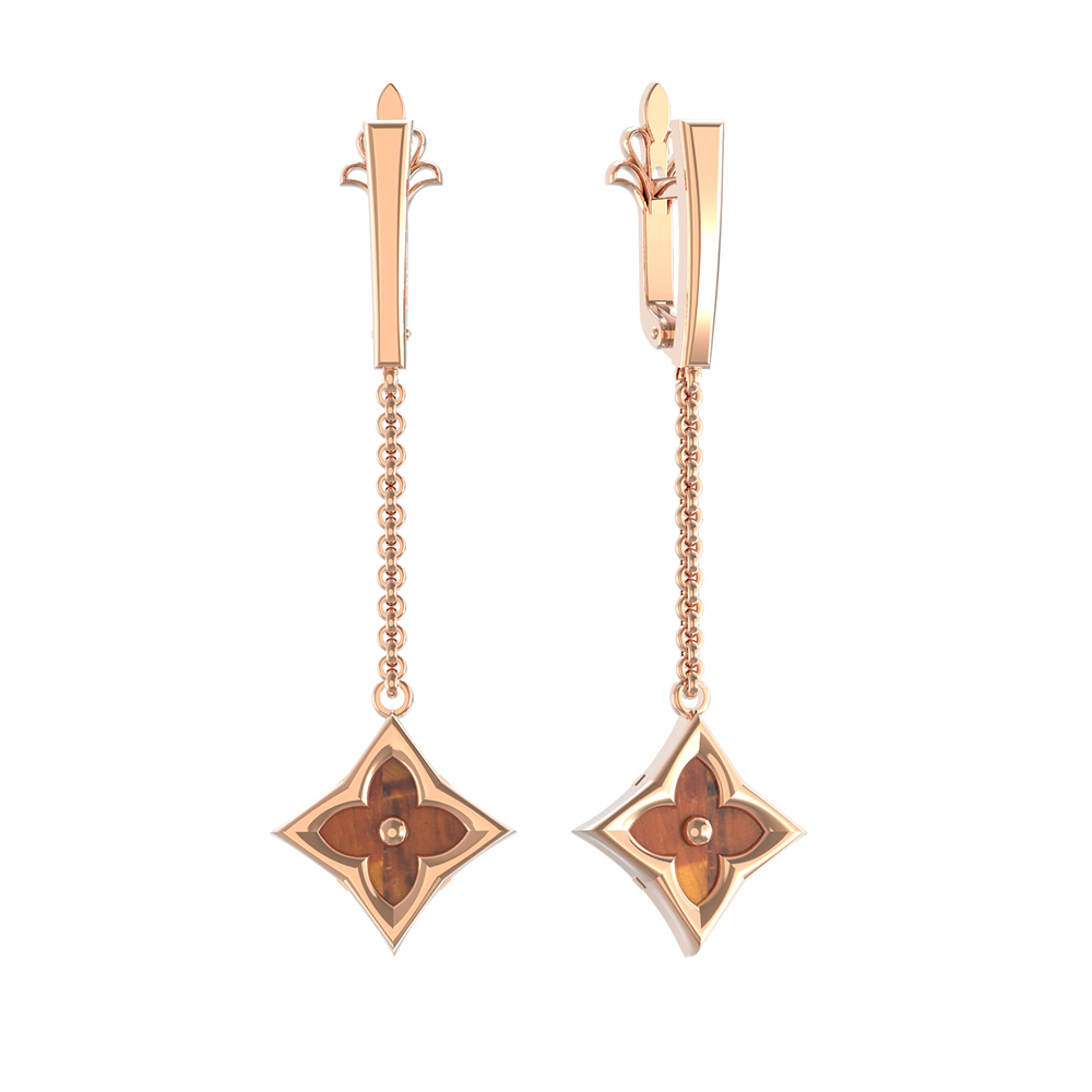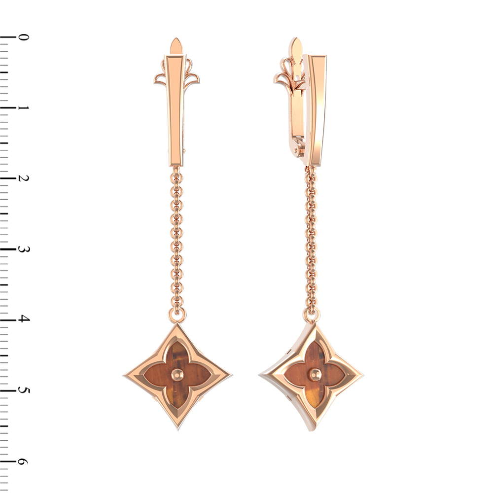 Элегантные серьги из красного золота 585 пробы станут изысканным дополнением к вашему образу. Изделие из коллекции De Luxe — Амальфи выполнено в утонченном дизайне «клевер», который придает украшению особую гармонию и эстетическую привлекательность. Центральным элементом композиции стали две вставки из натурального тигрового глаза. Теплый оранжевый цвет вставок, имеющих строгую форму ромба, эффектно контрастирует с благородным блеском красного золота.