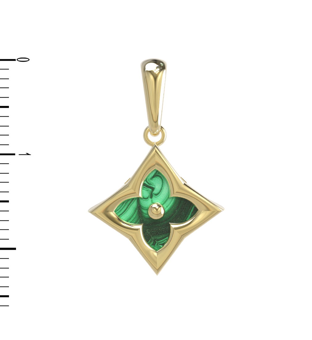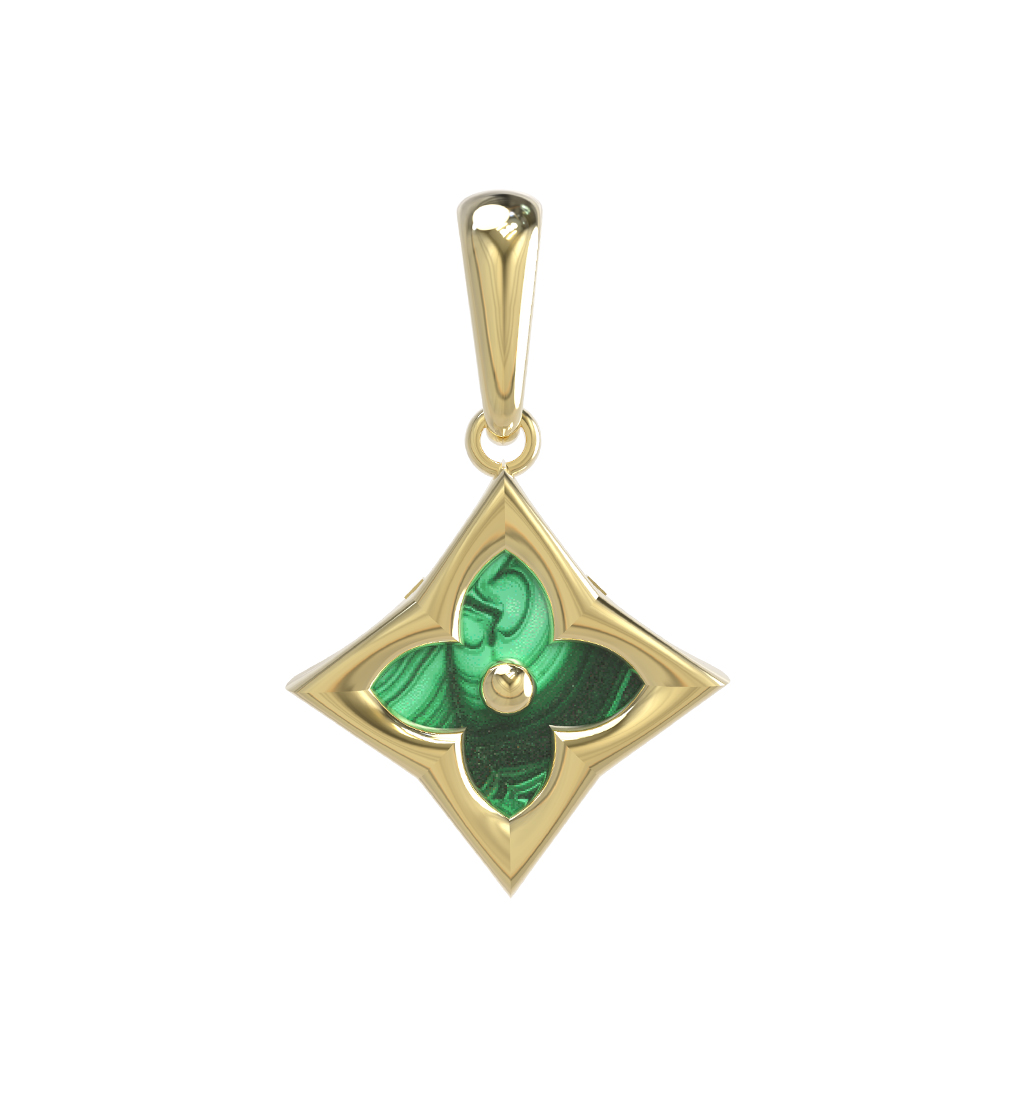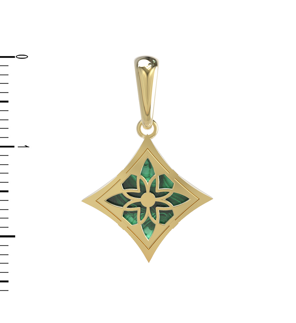Элегантная подвеска из лимонного золота 585 пробы — украшение, в котором благородство классических материалов встречается с современным дизайном. Это изделие, представленное в коллекции De Luxe — Амальфи, отличается выразительной геометрией: в центре внимания находится одна вставка из натурального малахита глубокого зелёного оттенка. Камень огранен в форме ромба, подчеркивающего уникальный природный узор минерала, а изящный дизайн в виде клевера придает украшению особую художественную ценность.