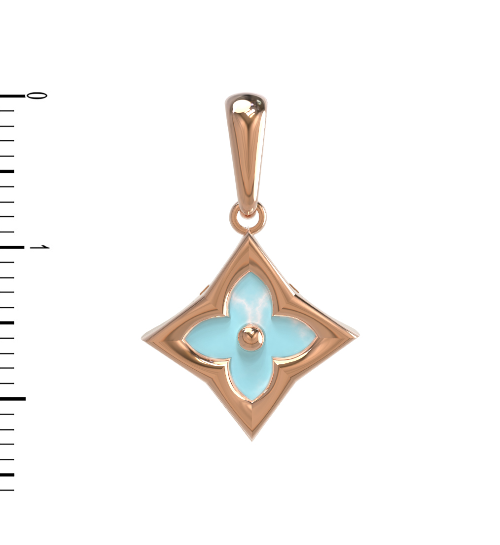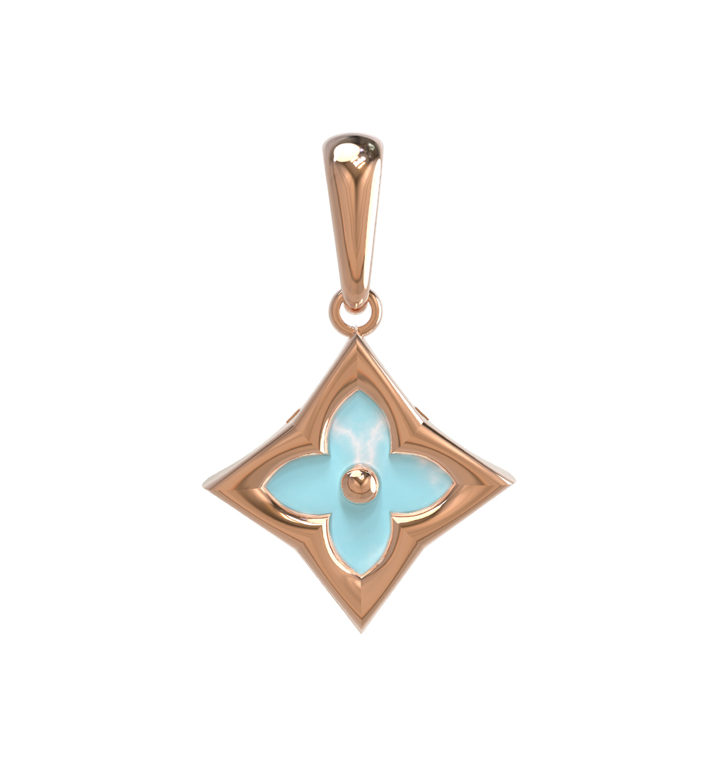 Одна вставка из бирюзы надежно закреплена в золотой оправе, подчеркивая статус и эстетику аксессуара. Лаконичный силуэт клевера и геометрическая точность формы делают подвеску из красного золота самодостаточным украшением, которое подчеркнет вашу индивидуальность и добавит нотку роскоши в повседневный гардероб.