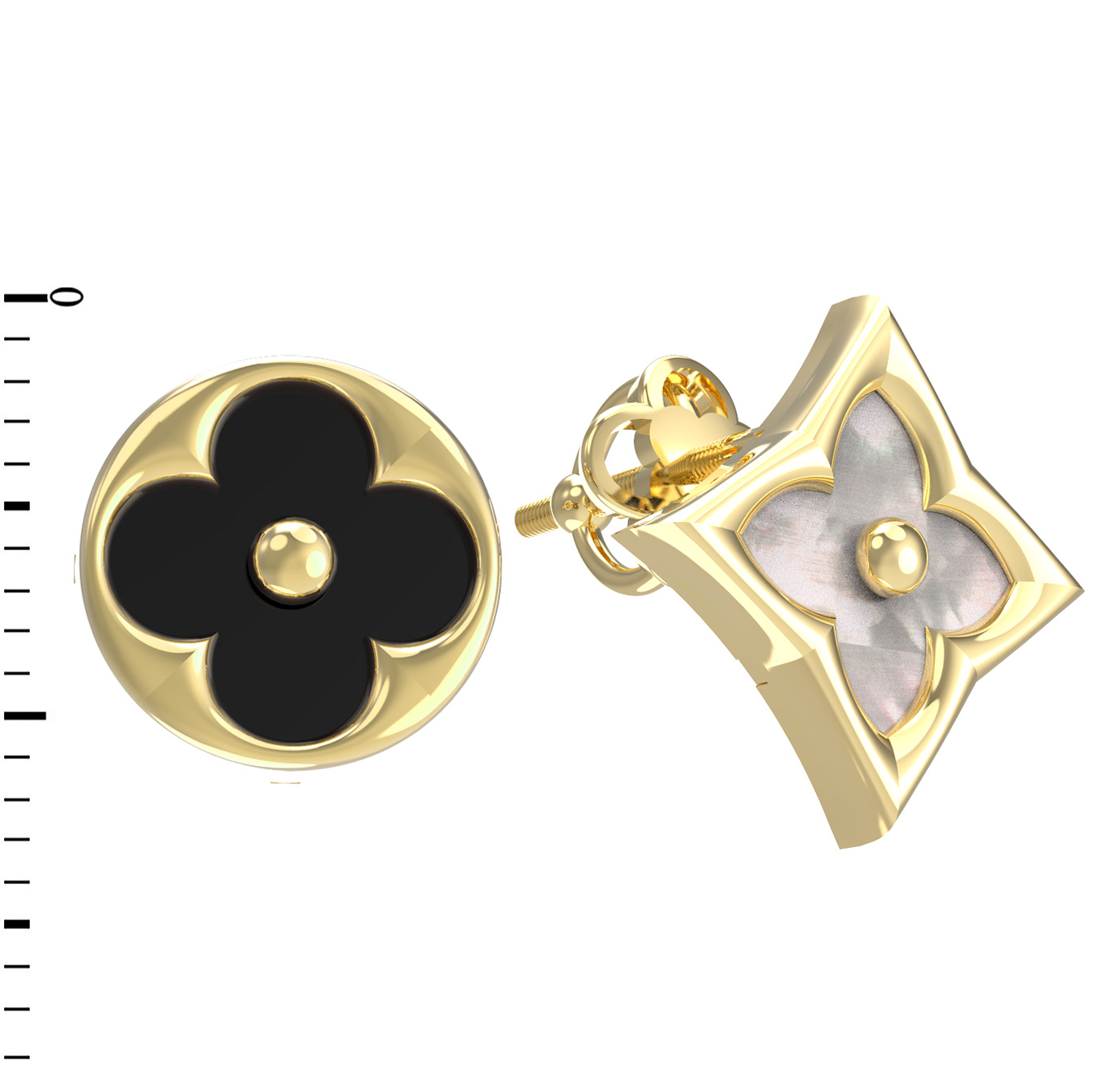 Особое внимание привлекает игра контрастов: вставки из глубокого черного оникса и нежного перламутра создают гармоничный тандем. Формы вставок — круг и ромб — придают украшению динамичность и современный вид, а наличие одной вставки в каждом элементе подчеркивает лаконичность композиции. Эти серьги станут великолепным дополнением к повседневному или вечернему образу, добавляя нотку роскоши и стиля.