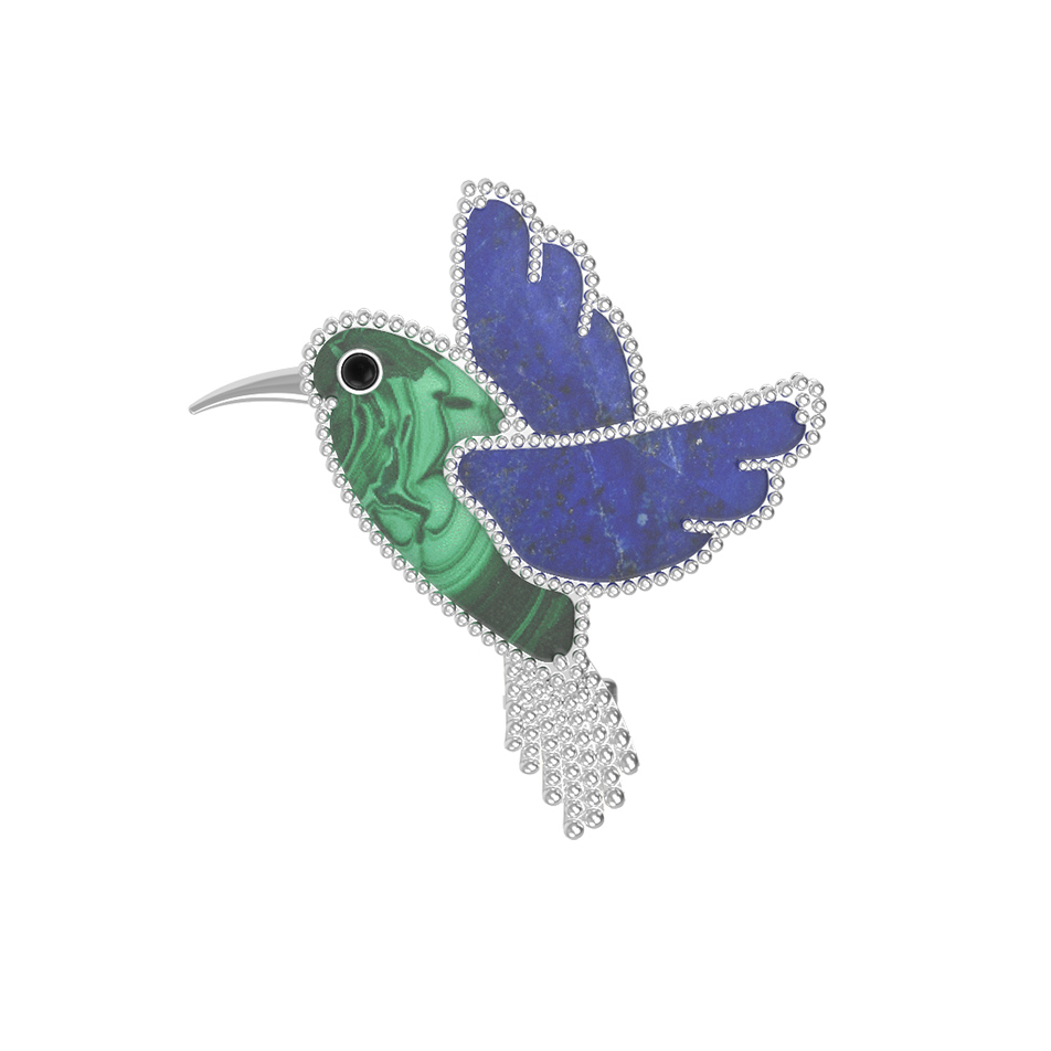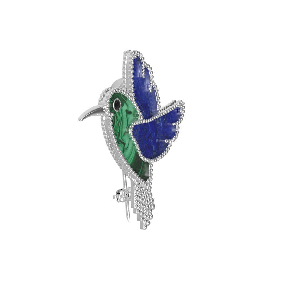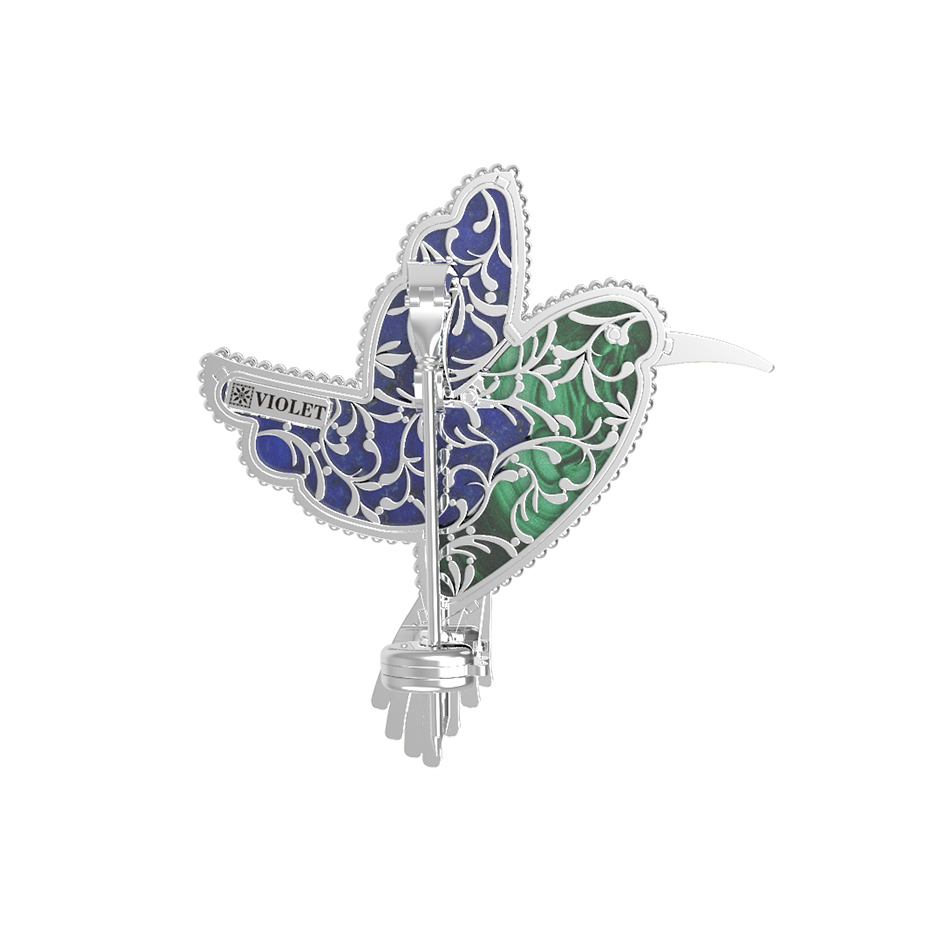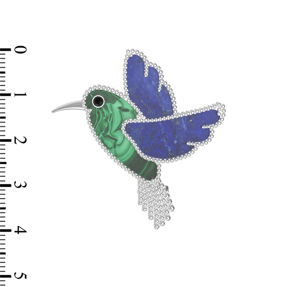 Центральное место в композиции занимают три контрастные вставки: глубокий синий лазурит и насыщенный зеленый малахит создают неповторимую игру цвета. Детали дополнены черной эмалью, придающей силуэту птицы завершенность и выразительность. Сочетание синего, зеленого и черного цветов делает брошь самодостаточным аксессуаром, который легко впишется в самые смелые стилистические решения.