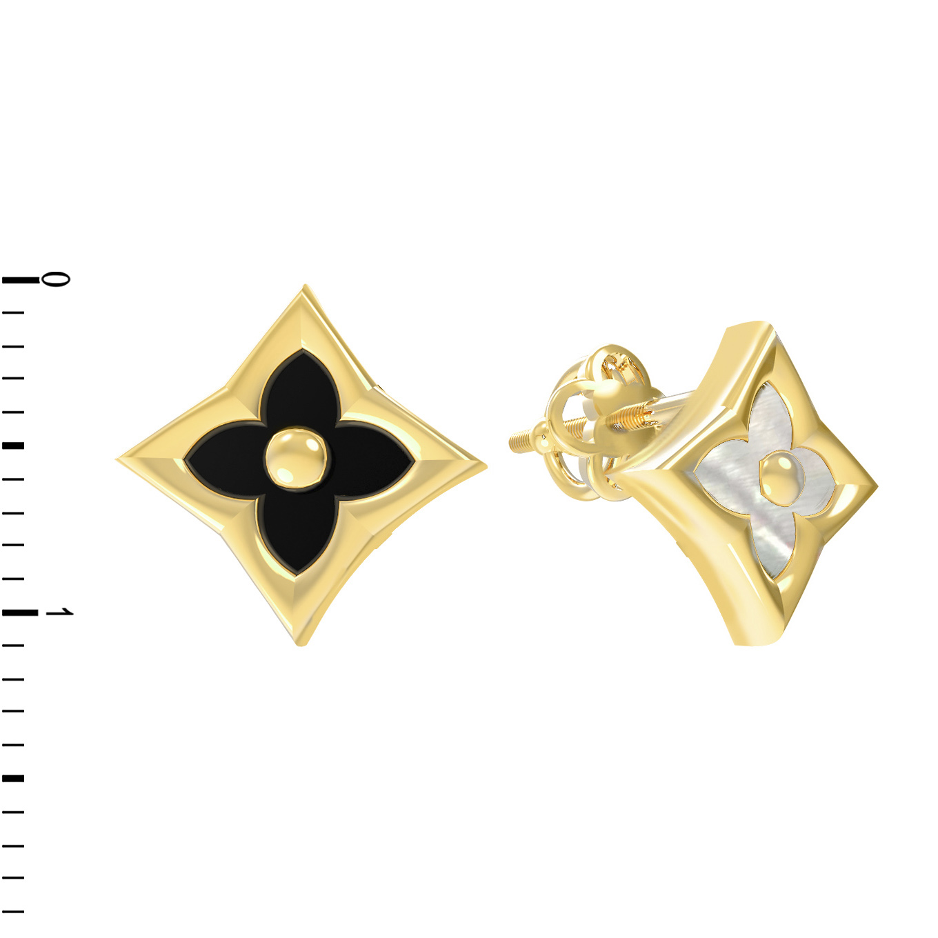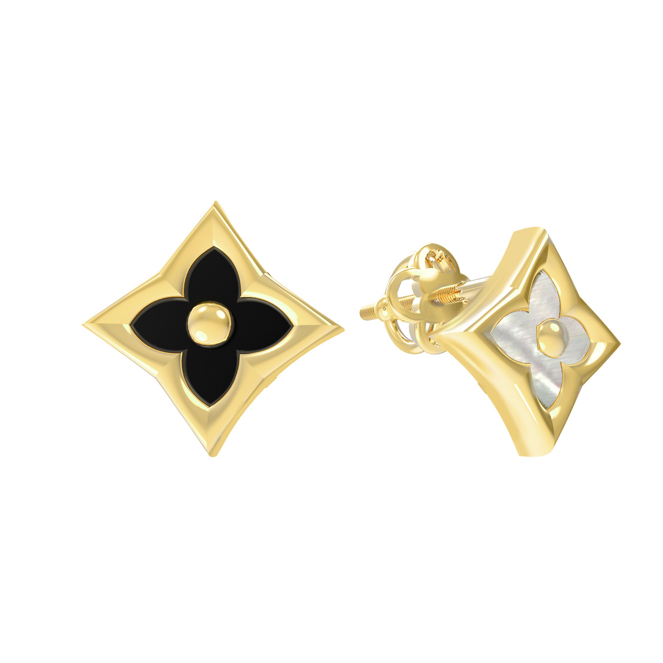 Дизайн модели вдохновлен природными мотивами: в центре каждой серьги располагается узнаваемый и символичный элемент в форме клевера, который придает образу нотки нежности и удачи. Строгая геометрия ромбовидной формы оправы придает изделию современный и динамичный вид. Контраст материалов делает украшение по-настоящему особенным: одна вставка выполнена из глубокого черного оникса, а другая — из нежного перламутра с мягким переливом.