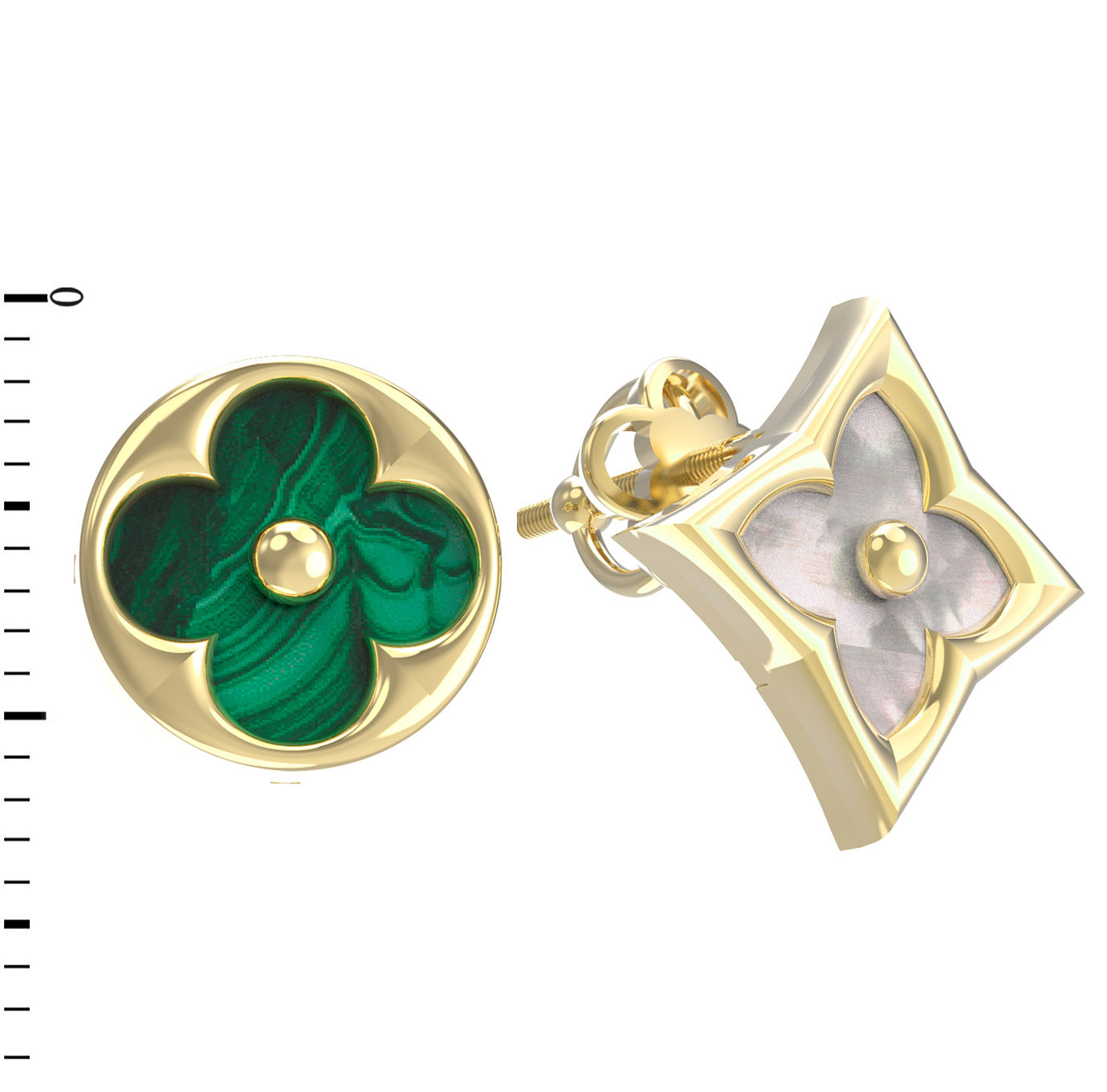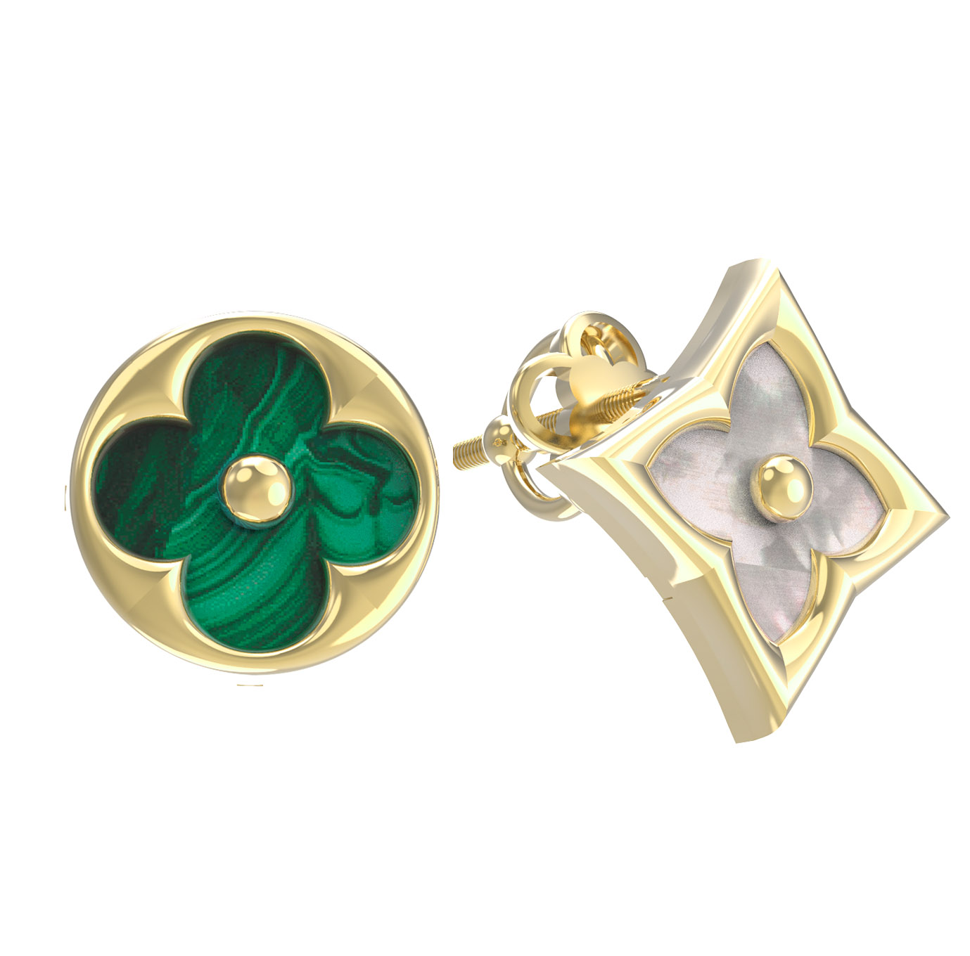В центре композиции гармонично сочетаются два природных камня: насыщенный зеленый малахит и нежный перламутр. Контраст материалов подчеркивается интересной геометрией форм вставок — круг и ромб создают динамичную композицию, которая приковывает взгляд. Эти серьги созданы для тех, кто ценит эстетику и внимание к деталям. Универсальный дизайн позволяет носить украшение как мужчинам, так и женщинам, подчеркивая индивидуальность и вкус обладателя.