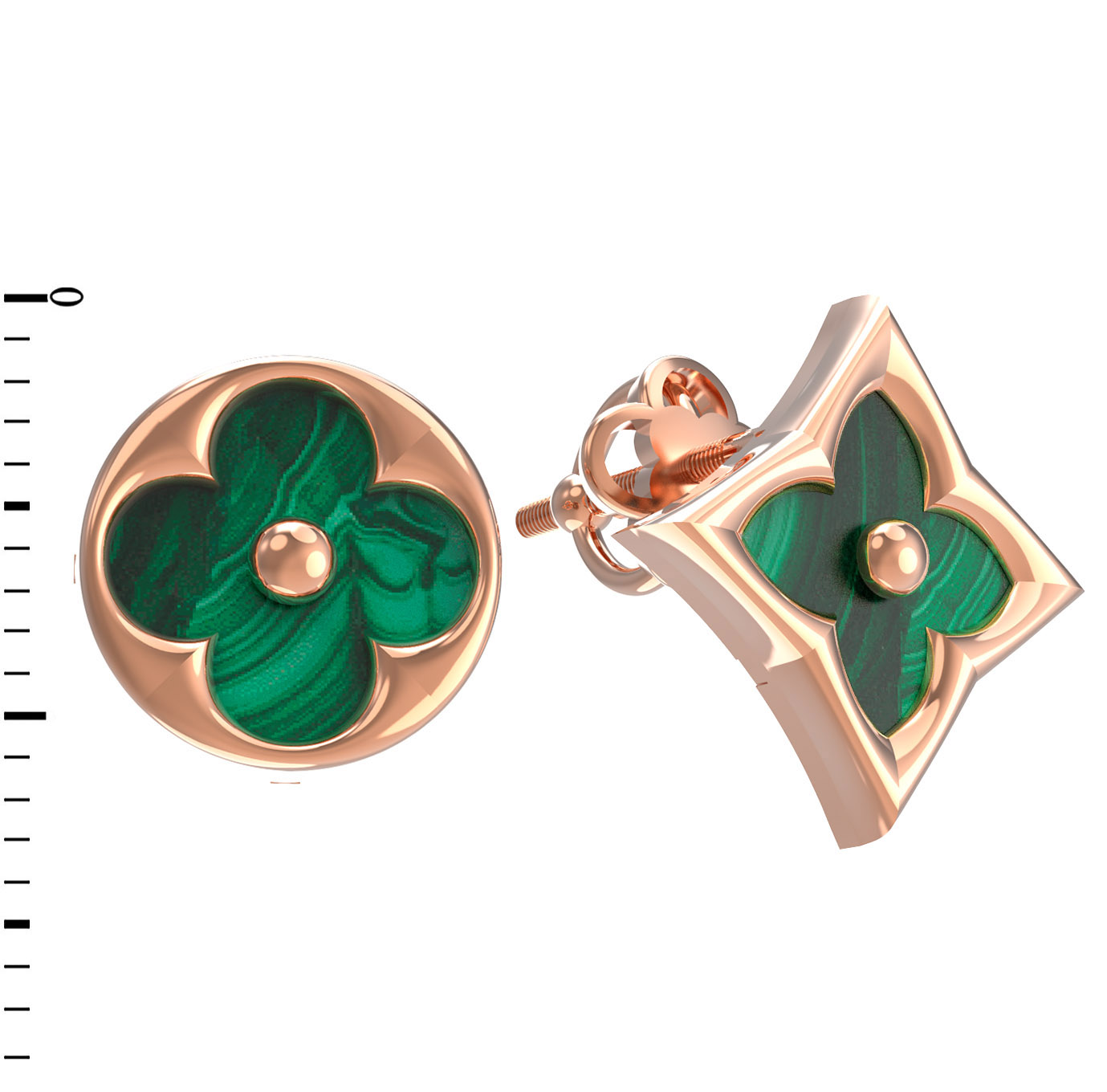 Особенностью модели является оригинальный дизайн в виде клевера, который придает изделию утонченность и узнаваемый шарм. Вставки из натурального малахита имеют две разные формы — круг и ромб, что создает интересную асимметрию и добавляет динамики образу. В каждой паре представлено 2 вставки, искусно закрепленные в золотой оправе.