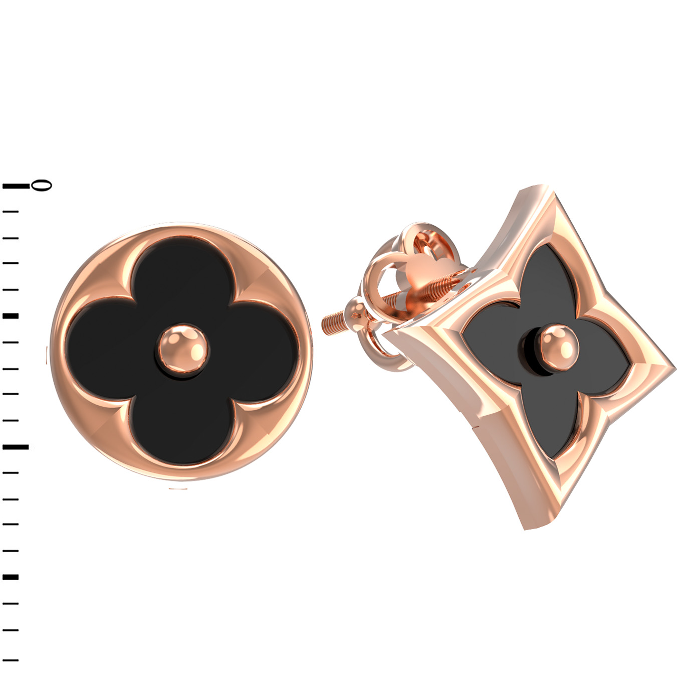 В центре композиции расположены две вставки из благородного черного оникса, которые эффектно контрастируют с теплым сиянием красного золота. Особенность этих серег заключается в разнообразии форм вставок: одна из них выполнена в форме круга, а другая — в форме ромба, что добавляет изделию динамики и оригинальности.