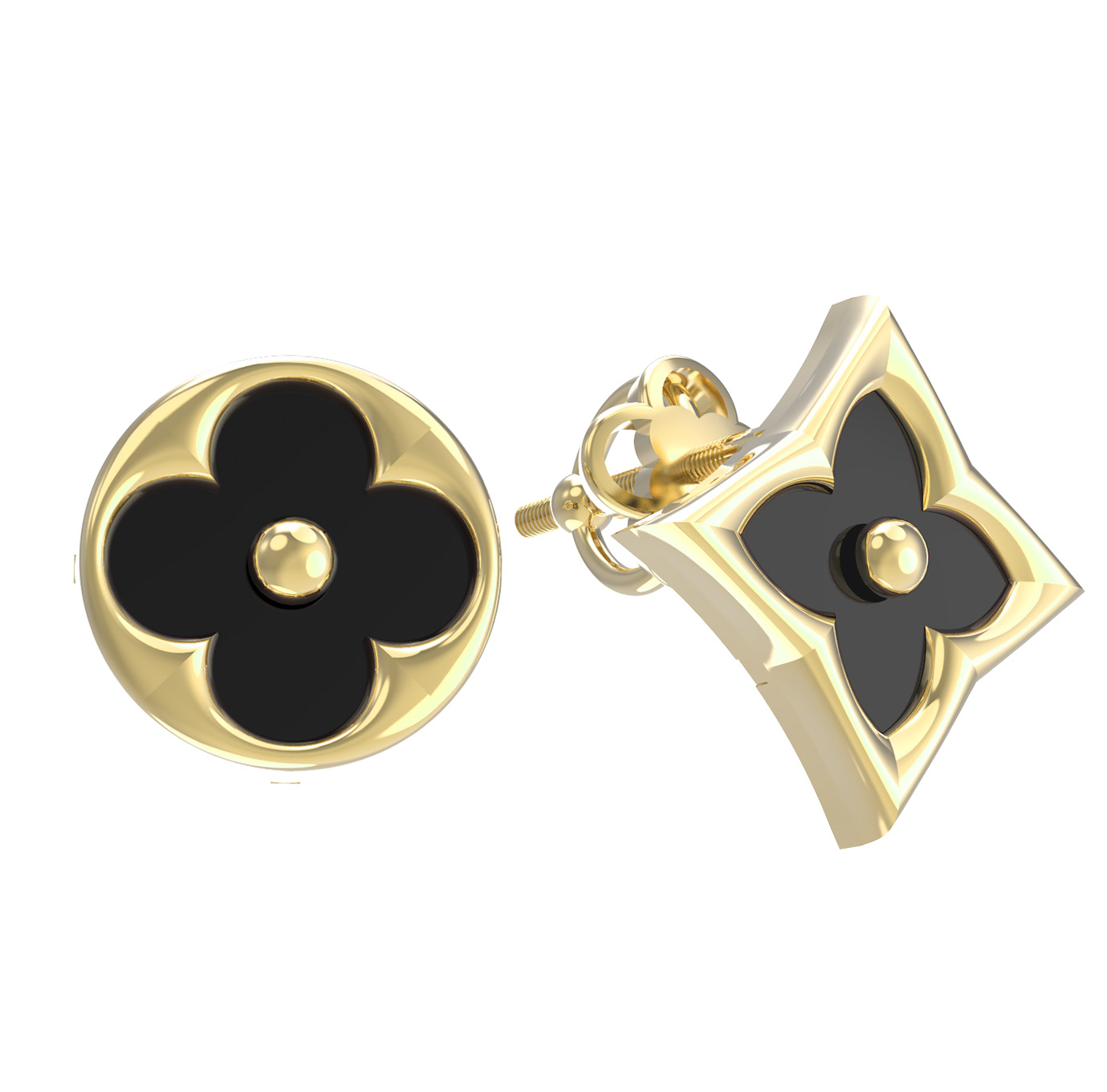 Центральным элементом композиции выступают вставки из оникса глубокого черного цвета. Контрастное сочетание сияющего золота и темного минерала создает выразительный визуальный эффект. Серьги декорированы двумя вставками, которые отличаются оригинальностью форм: одна из них выполнена в форме круга, а другая — в форме ромба, что делает украшение нетривиальным и запоминающимся. Лаконичная геометрия линий идеально гармонирует с классической элегантностью.