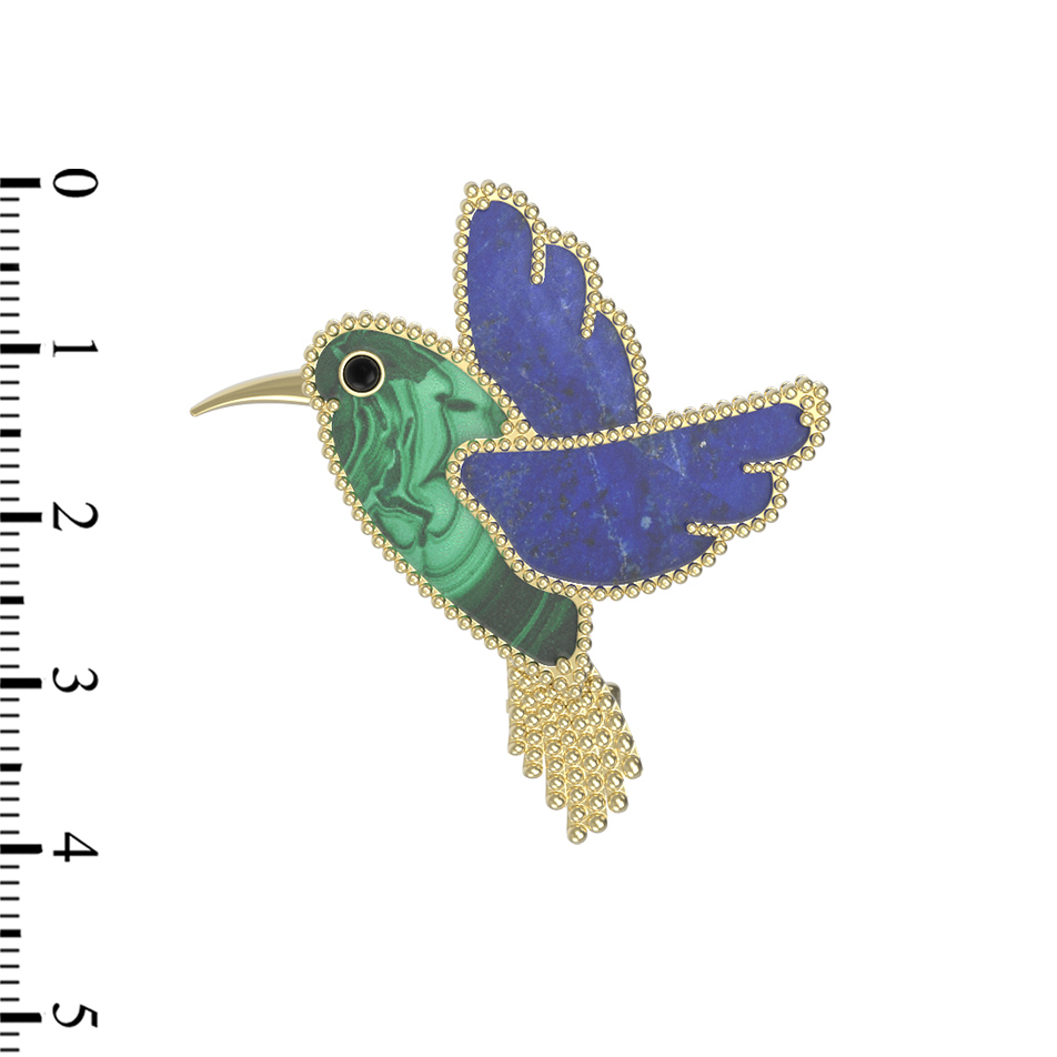 Элегантная брошь в виде птицы из коллекции De Luxe — В стране чудес станет ярким акцентом в вашем образе, подчеркивая безупречный вкус и внимание к деталям. Дизайнерское украшение выполнено из лимонного золота 585 пробы, чей благородный оттенок придает изделию особое очарование и теплоту. В центре композиции — искусно подобранная комбинация материалов: насыщенный зеленый малахит и глубокий синий лазурит создают эффектный контраст, подчеркнутый акцентами черной эмали. Всего в модели использовано 3 вставки, гармонично объединенные в единый художественный образ.