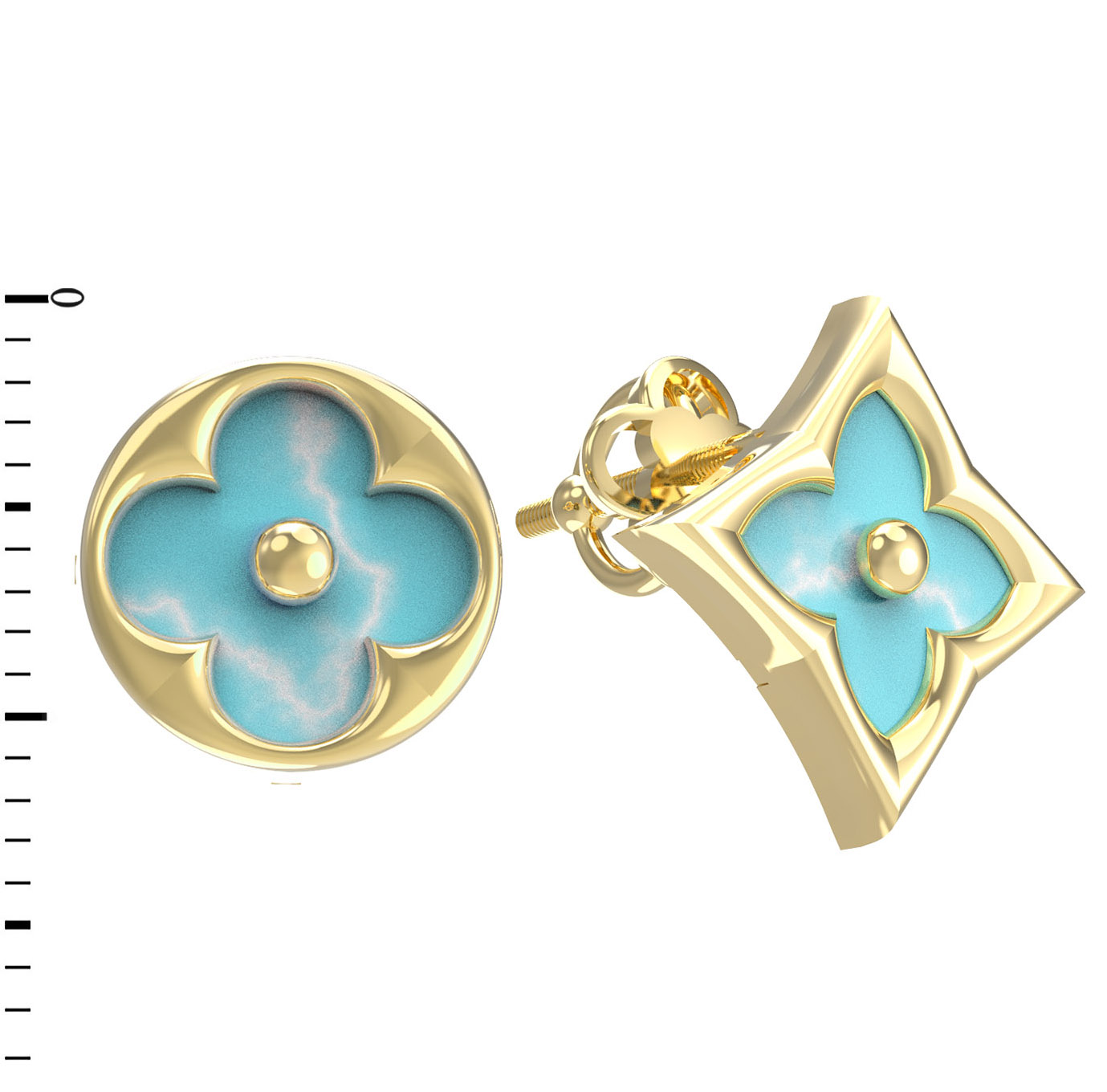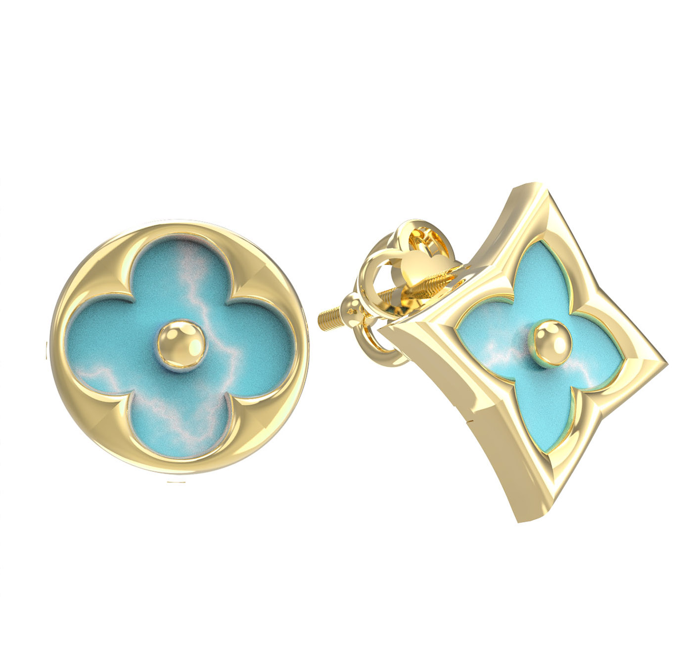 Элегантность и утонченность слились воедино в этих уникальных серьгах из коллекции De Luxe — Амальфи. Ювелирное изделие выполнено из благородного лимонного золота 585 пробы, которое придает украшению теплый, солнечный оттенок и особое сияние. Дизайн модели вдохновлен природной эстетикой и геометрией: центральным элементом декора стал узнаваемый мотив клевера, подчеркнутый вставками из натуральной бирюзы. Нежный бирюзовый цвет камня гармонично сочетается с лимонным металлом, создавая запоминающийся контраст.
