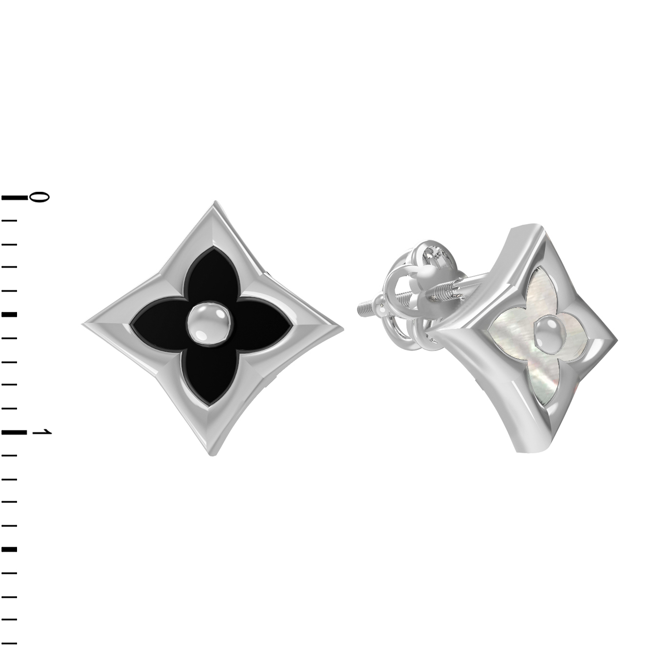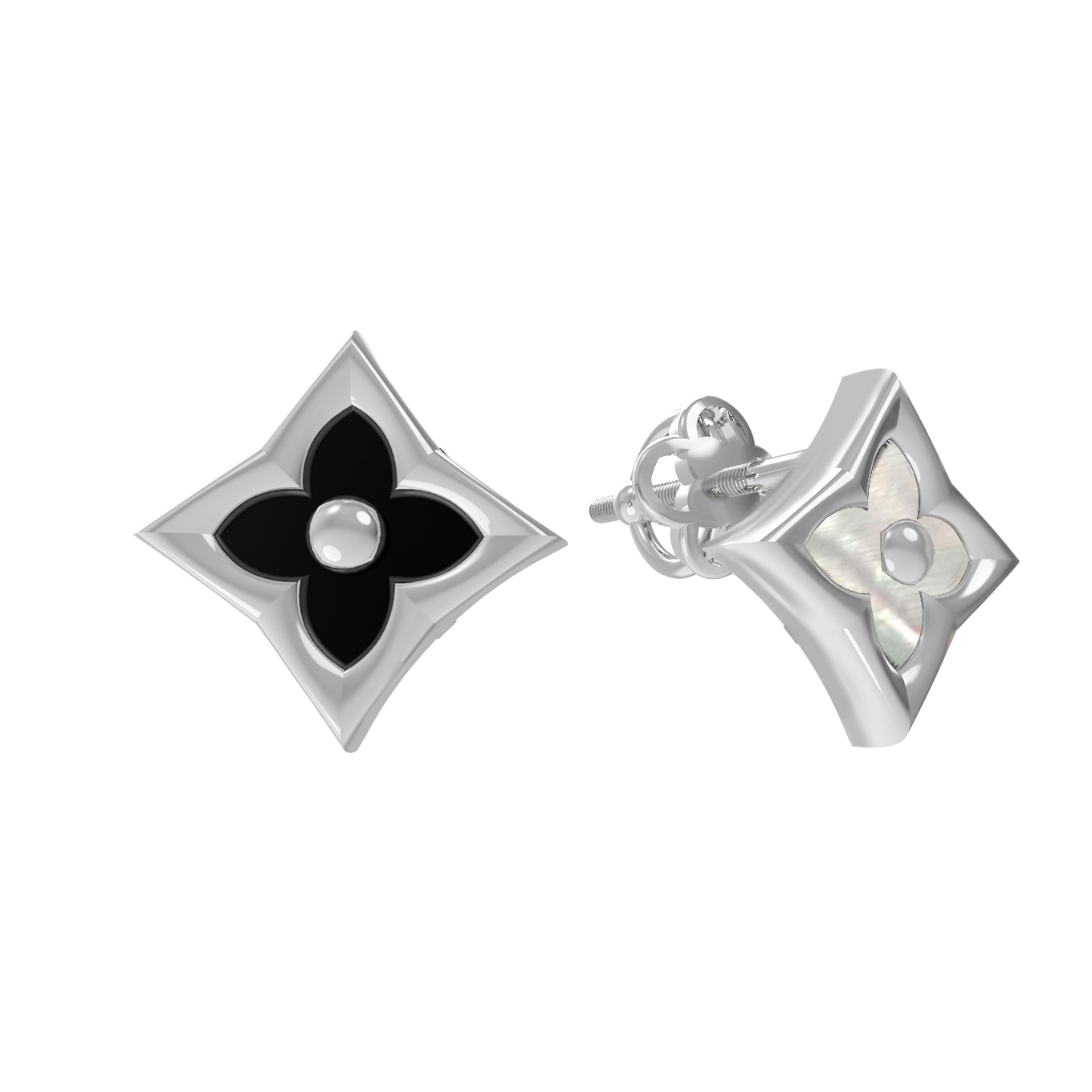 Центральным элементом композиции является вставка ромбовидной формы, в которой мастерски сочетаются контрастные цвета. Черный оникс придает серьгам строгость и глубину, а нежный перламутр добавляет мягкого сияния и переливов. Сочетание этих природных материалов создает уникальный визуальный эффект, притягивающий взгляд. Качественное белое золото служит идеальной оправой, подчеркивая насыщенность черного цвета и перламутровое свечение вставок.