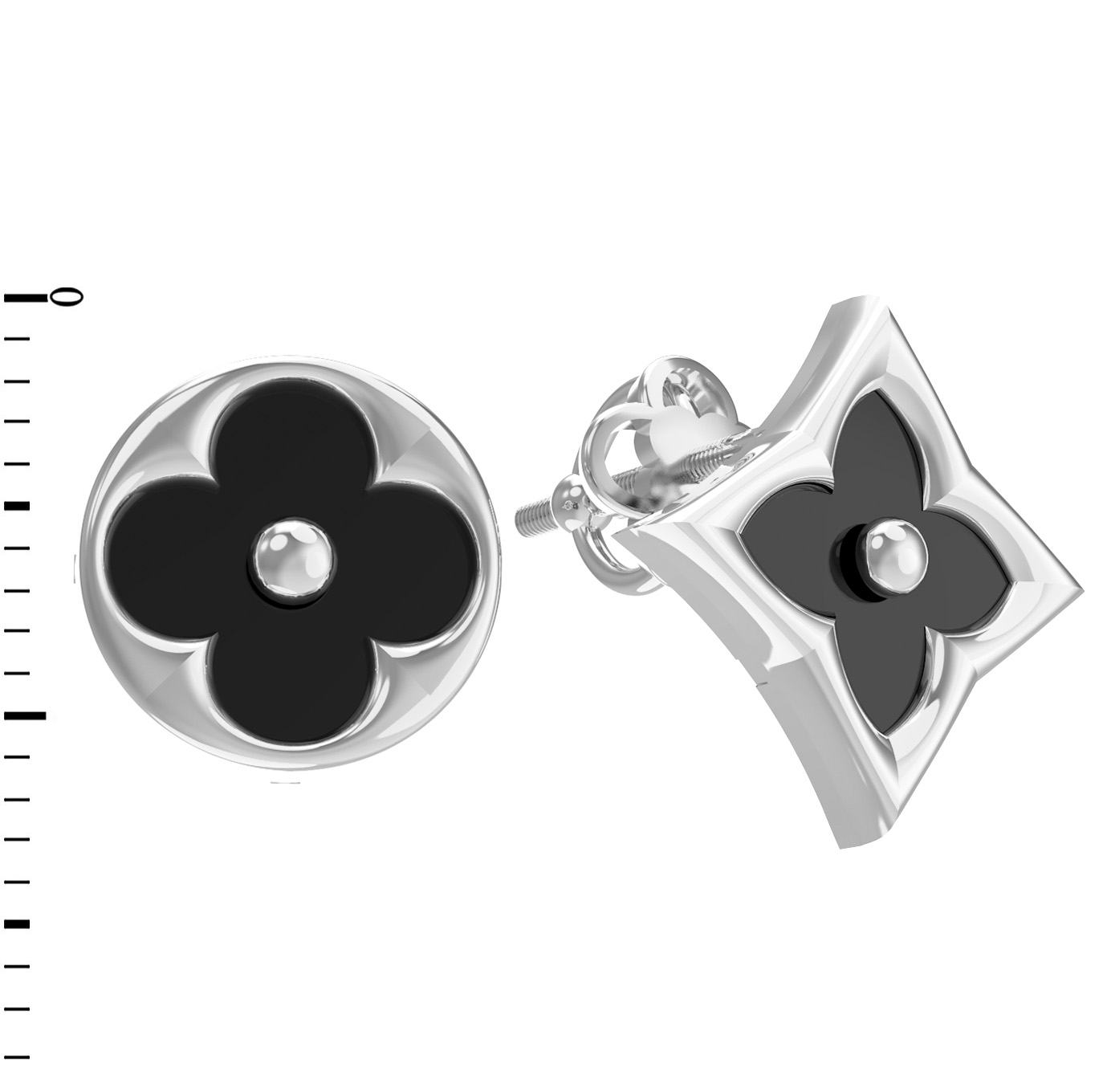 Центральным элементом изделия стал глубокий черный оникс, который контрастно выделяется на фоне благородного белого золота. Дизайн украшения вдохновлен символикой клевера, что придает ему особенный шарм. В этой модели реализована интересная игра геометрических форм: одна вставка выполнена в форме круга, а другая — в форме ромба, что делает серьги оригинальными и запоминающимися. Общее количество вставок составляет 2 штуки. Каждая деталь проработана с максимальной тщательностью, создавая завершенный и эстетически привлекательный вид. Эти серьги — выбор тех, кто ценит лаконичность форм и высокое качество ювелирного исполнения.