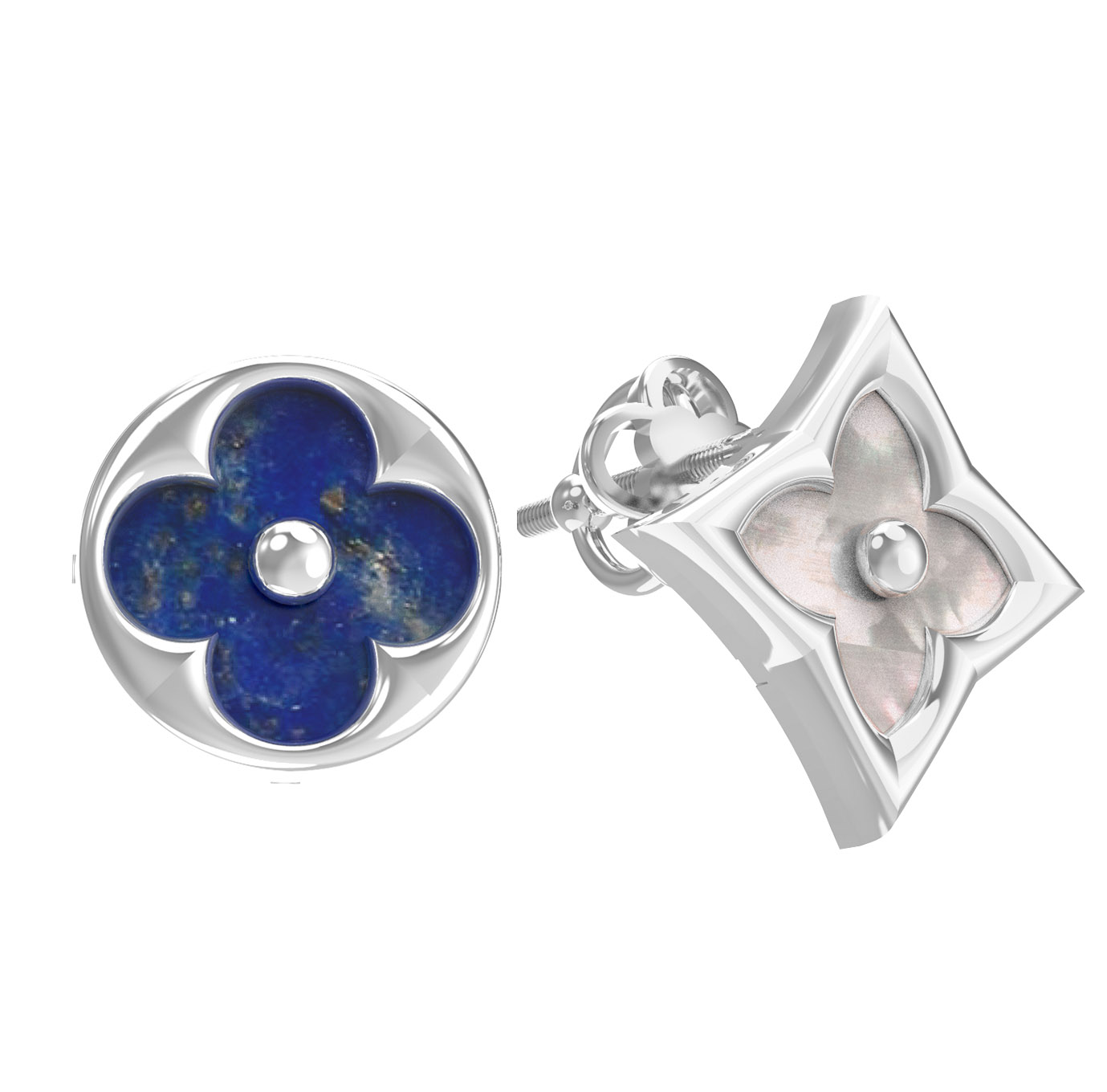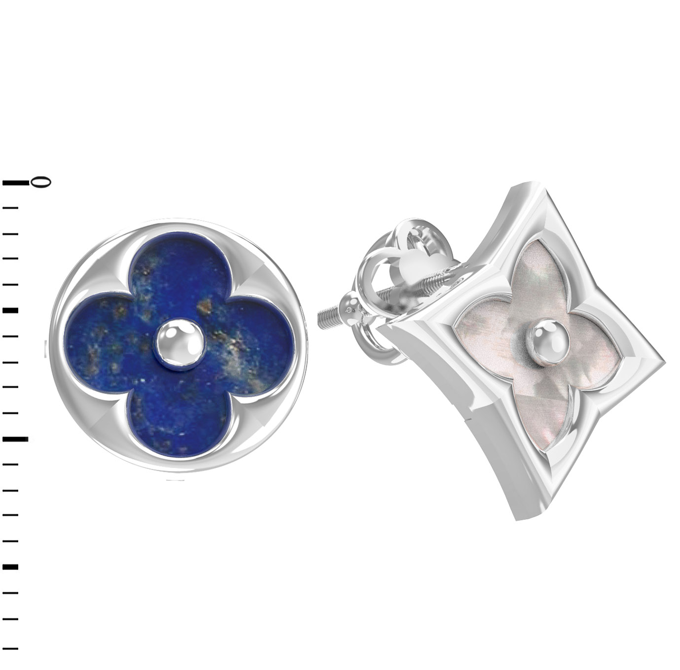 Особенность данной модели заключается в контрастном сочетании материалов и форм. Одна вставка представляет собой глубокий синий лазурит в круглой оправе, вторая — нежный перламутр, заключенный в ромбовидную форму. Такое сочетание создает гармоничный и выразительный визуальный эффект. Серьги прекрасно смотрятся как самостоятельный аксессуар, так и в составе комплекта, дополняя ваш гардероб ноткой роскоши.