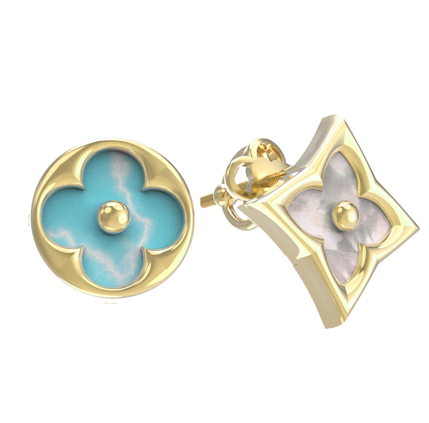 Центральным элементом композиции выступает гармоничное сочетание двух вставок: яркой бирюзы бирюзового цвета и нежного перламутра. Контраст материалов и форм вставок — круглой и ромбовидной — создает динамичный и выразительный облик. Лаконичность линий и высокое качество исполнения превращают эти серьги в аксессуар, который будет уместен в любой ситуации. При желании вы можете дополнить свой образ другими украшениями, собрав полноценный комплект, который станет завершающим штрихом вашего стиля.