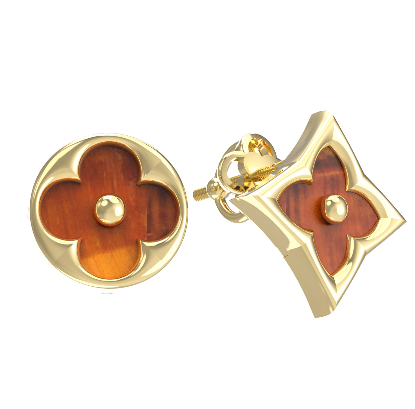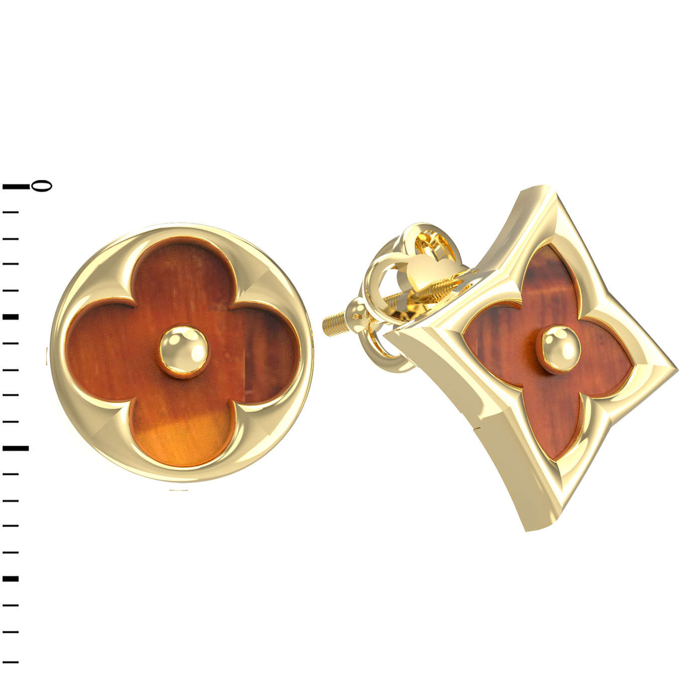Центральным элементом украшения выступает натуральный тигровый глаз оранжевого цвета. Две вставки имеют необычное исполнение: одна выполнена в форме круга, вторая — в форме ромба, что создает интересный асимметричный визуальный эффект. Теплый блеск лимонного металла идеально сочетается с глубоким переливом камня, создавая эстетичный дуэт. Ювелирное изделие выполнено с исключительным вниманием к деталям и надежно фиксируется на мочке уха.