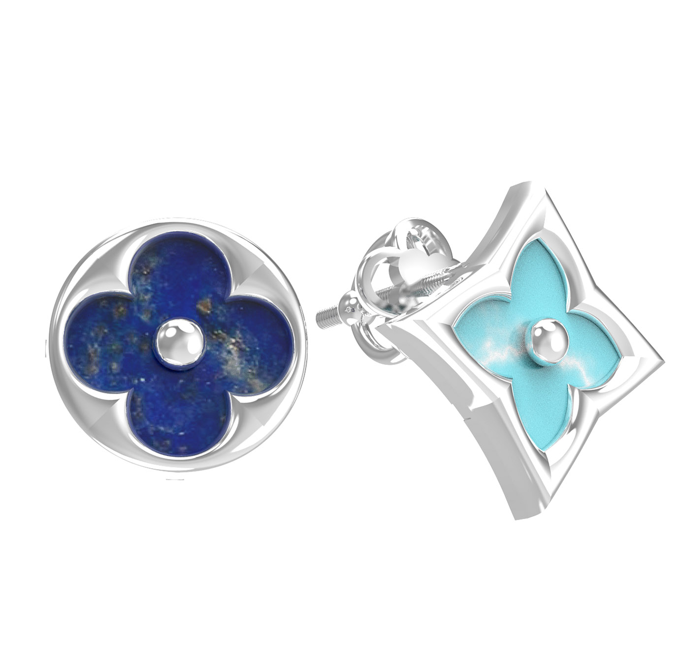 Серьги отличаются оригинальной концепцией: каждая из двух вставок имеет свою форму и оттенок, создавая гармоничный контраст. В изделии использованы натуральные камни: яркая бирюза бирюзового цвета круглой формы и насыщенный лазурит синего цвета в форме ромба. Такое сочетание материалов и геометрических линий делает украшение выразительным акцентом в любом образе. Белое золото идеально обрамляет вставки, создавая цельную и завершенную композицию.