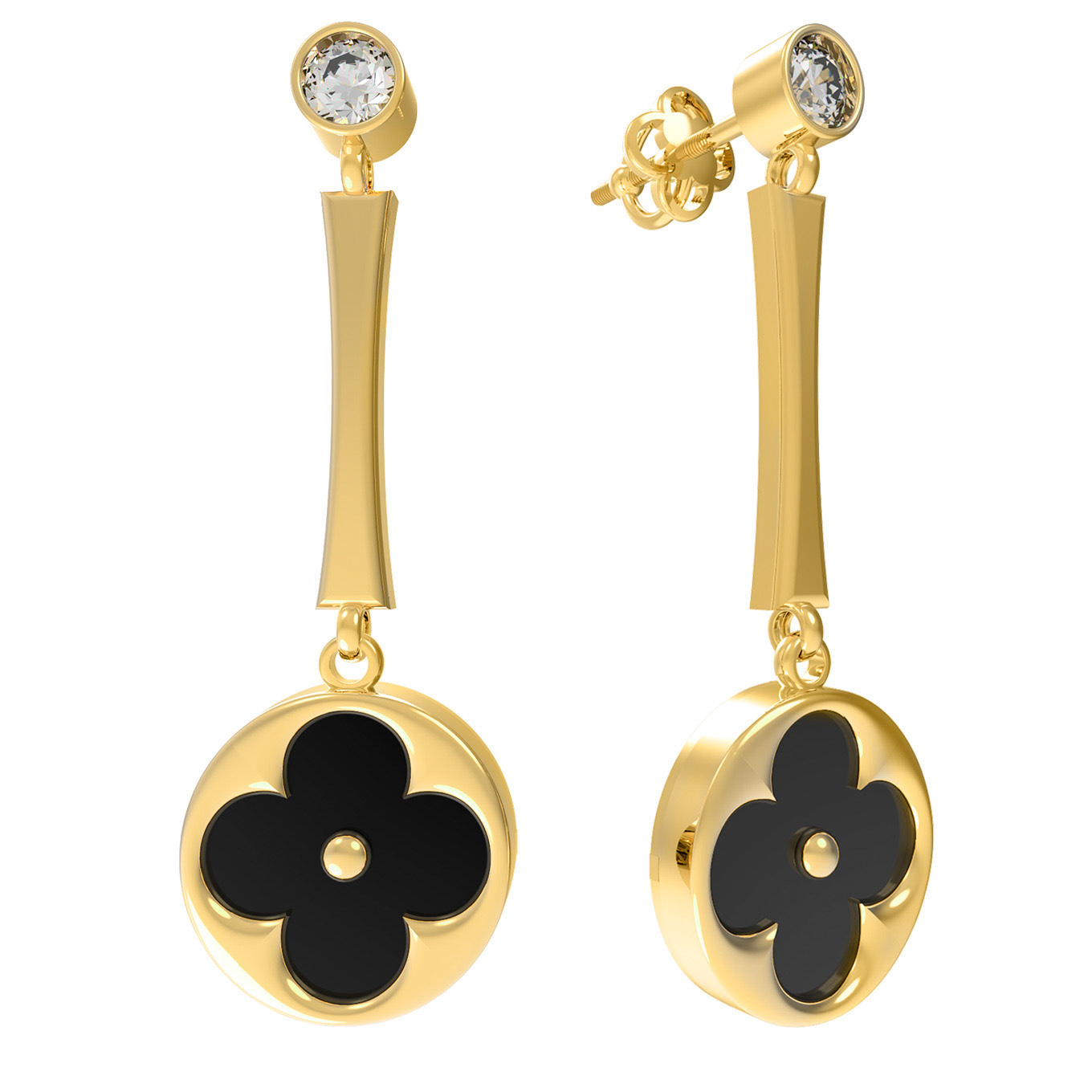 Элегантные серьги из коллекции De Luxe — Амальфи воплощают в себе безупречное сочетание классики и современного стиля. Изделие выполнено из благородного лимонного золота 585 пробы, чей теплый солнечный оттенок идеально подчеркивает контраст вставок. Центральным элементом композиции является изысканный дизайн в форме клевера, придающий украшению особый шарм и узнаваемость. Для декорирования использовано сочетание глубокого черного оникса и сверкающего белого фианита, создающих гармоничный дуэт.