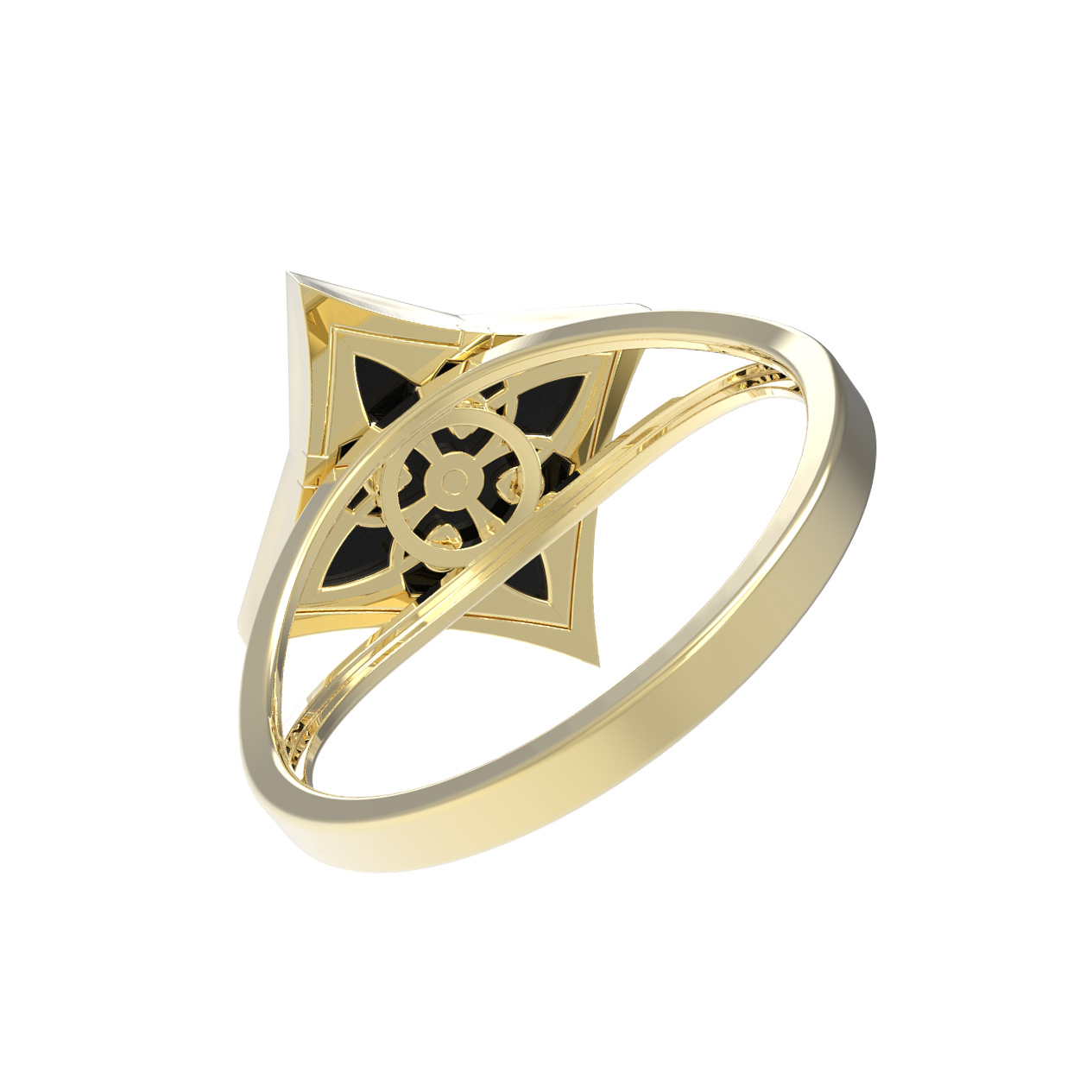 Элегантное кольцо из лимонного золота 585 пробы — это воплощение изысканности и лаконичного стиля. Ювелирное изделие, представленное в коллекции De Luxe — Амальфи, привлекает внимание своей необычной формой и контрастным сочетанием благородных материалов. Центром композиции является выразительная вставка из оникса глубокого черного цвета, выполненная в форме ромба, которая эффектно подчеркивает сияние драгоценного металла.