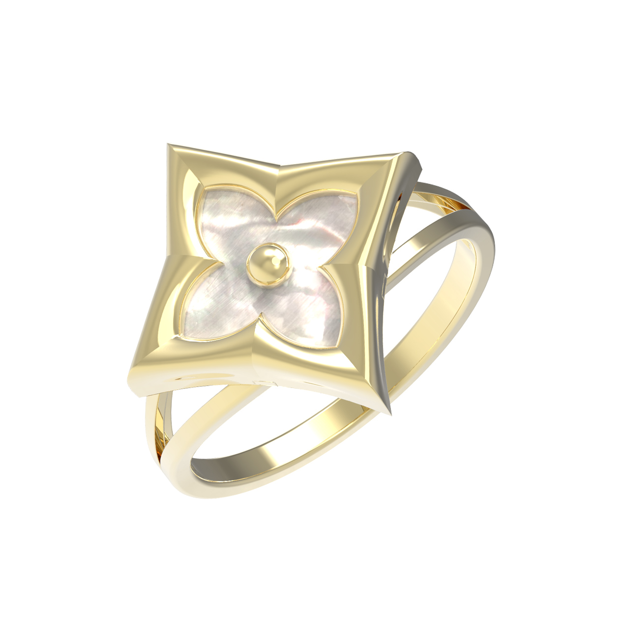 Элегантное кольцо из лимонного золота 585 пробы из коллекции De Luxe — Амальфи станет идеальным акцентом вашего образа. Дизайн украшения выполнен в утонченном стиле: центральный элемент в форме клевера дополнен изысканной вставкой из перламутра ромбовидной формы. Нежный перелив перламутра гармонично сочетается с теплым, солнечным блеском металла, создавая композицию, которая притягивает взгляды своей эстетикой и качеством исполнения.