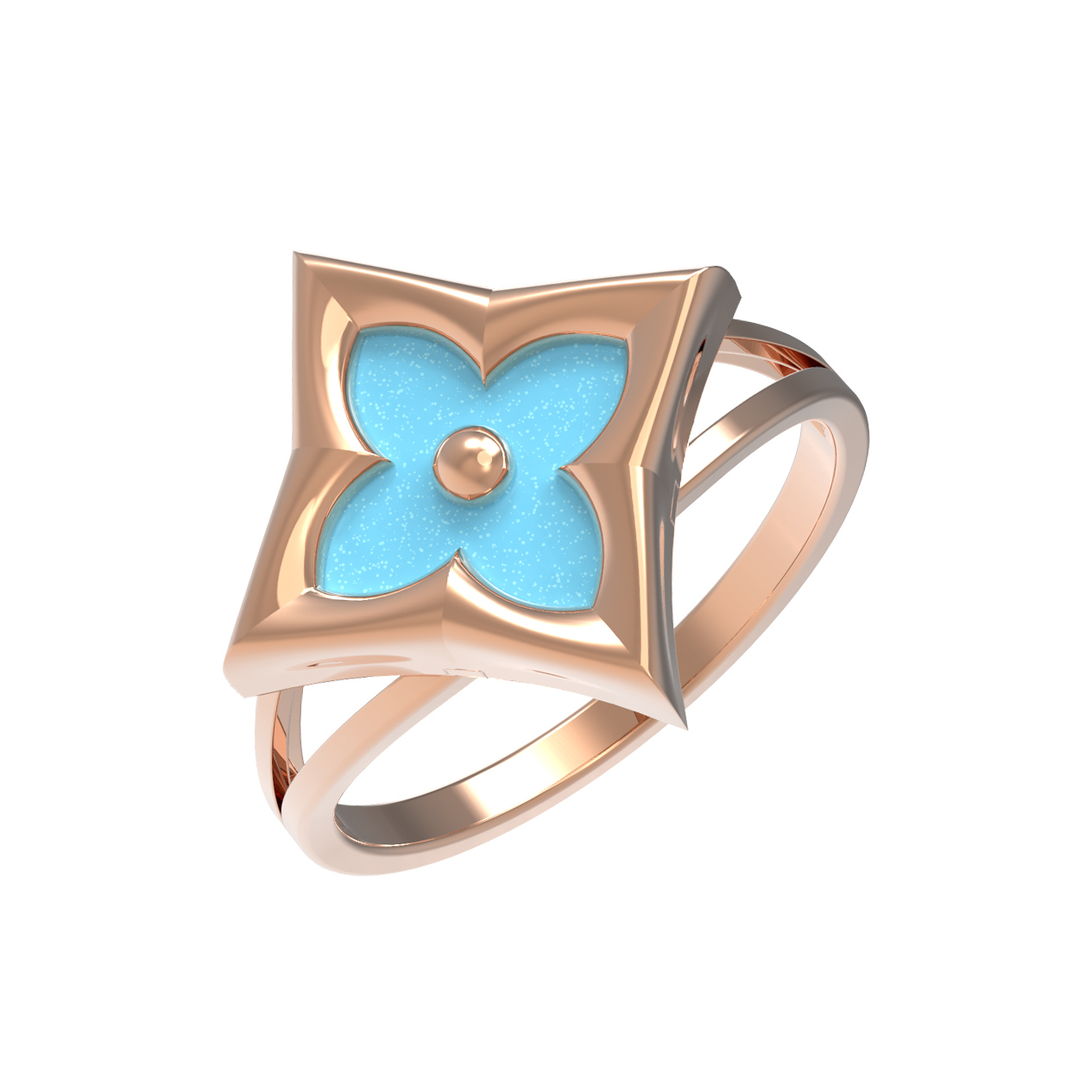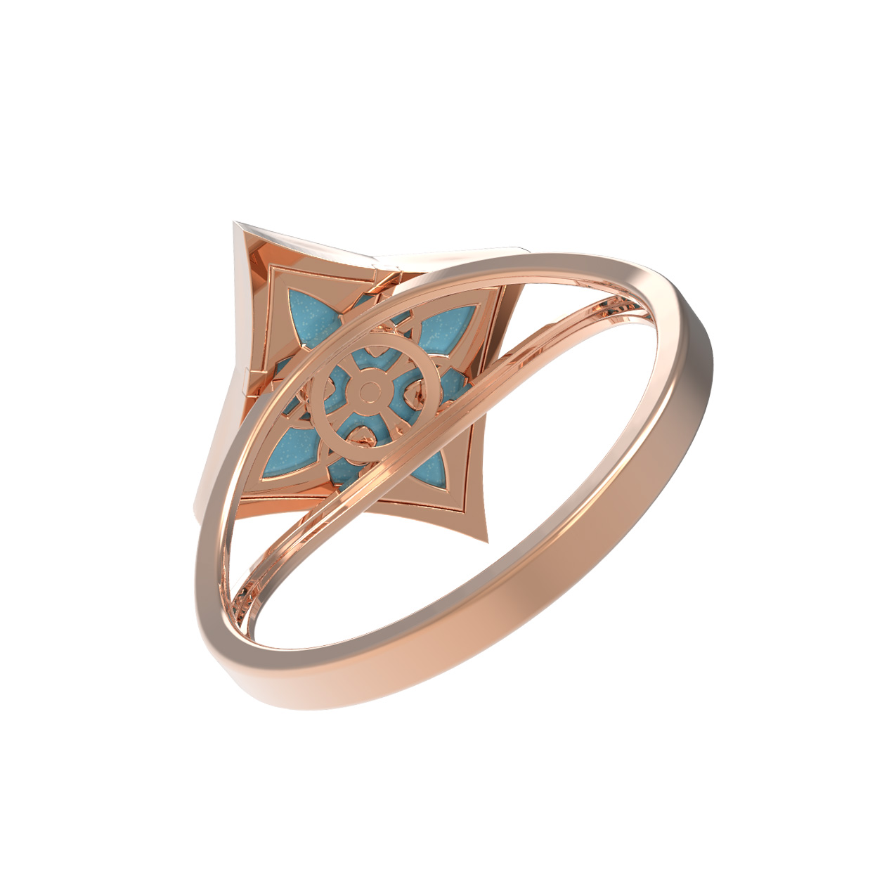 Элегантное кольцо из коллекции De Luxe — Амальфи станет достойным дополнением вашего ювелирного гардероба. Украшение выполнено из красного золота 585 пробы, чей благородный теплый оттенок подчеркивает природную красоту вставки. Центральным элементом дизайна выступает вставка из бирюзы бирюзового цвета, выполненная в оригинальной форме ромба, напоминающей цветок клевера. Контраст между сияющим красным металлом и нежным оттенком камня создает выразительный и запоминающийся образ.