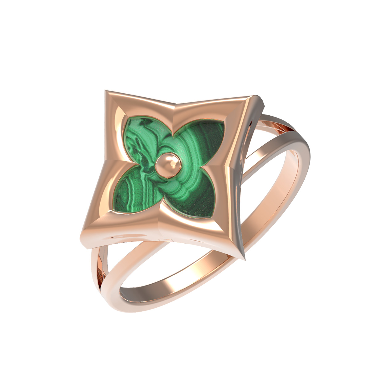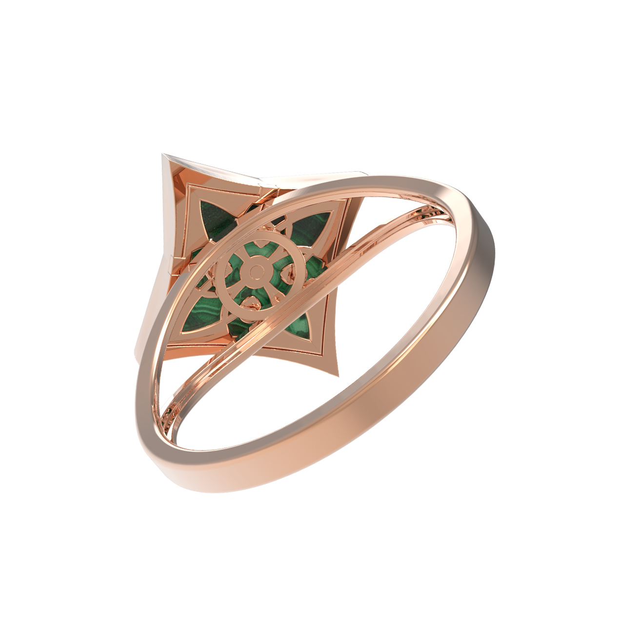 Кольцо из красного золота 585 пробы — это воплощение изысканности и утонченного стиля. Центральным элементом украшения выступает глубокий зеленый малахит, который мастерски инкрустирован в оправу необычной формы, напоминающей клевер. Единственная вставка, выполненная в виде ромба, притягивает взгляд своей природной текстурой и гармонично сочетается с теплым блеском драгоценного металла.