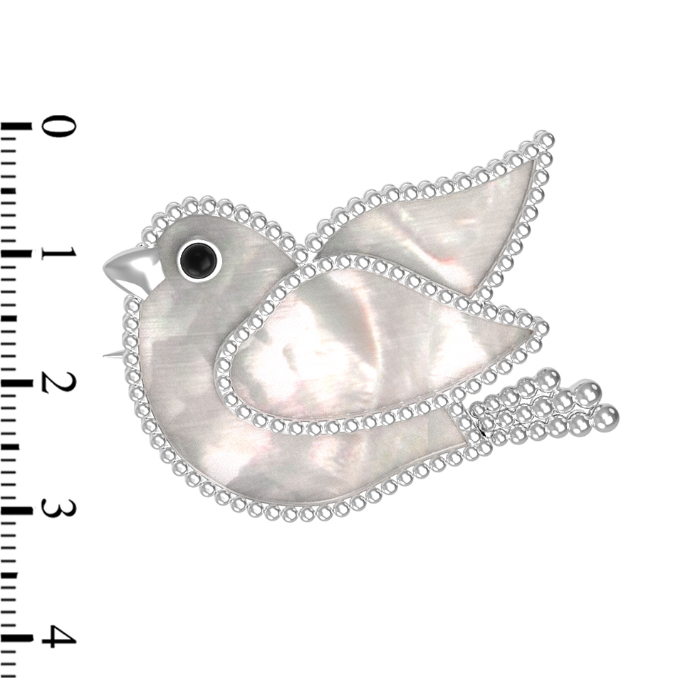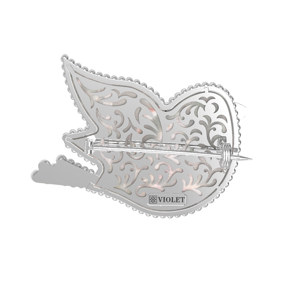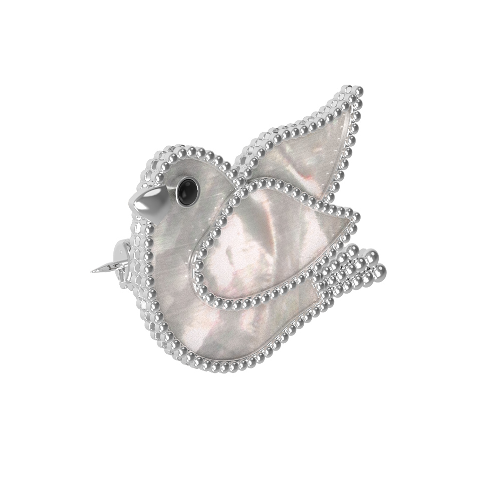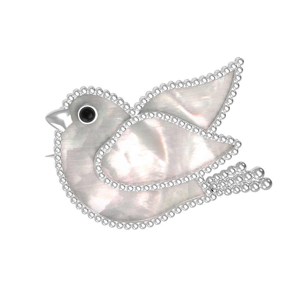 Центральным элементом броши стали вставки из натурального перламутра, которые придают изделию мягкое сияние, и яркой эмали. Разноцветный акцент эмали в сочетании с перламутровым переливом делает украшение живым и выразительным. Белый цвет металла гармонично подчеркивает глубину вставок, создавая законченный и премиальный образ.