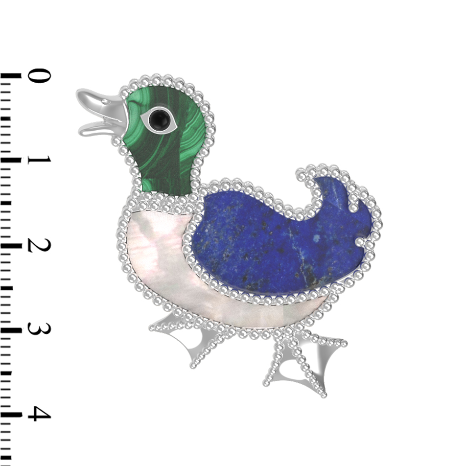 Эффектная брошь из белого золота 585 пробы станет ярким акцентом вашего образа, привнося в него нотки сказочного очарования. Дизайн изделия выполнен в виде фигурки птицы, напоминающей уточку, что делает украшение необычным и запоминающимся дополнением к коллекции De Luxe — В стране чудес. Ювелирная композиция сочетает в себе благородство металла и природную красоту камней.