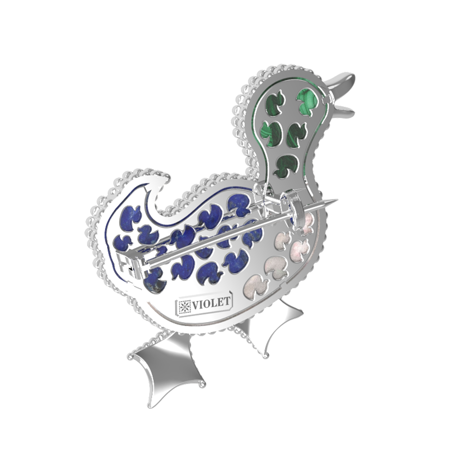Брошь из белого золота c эмалью, лазуритом, малахитом и перламутром