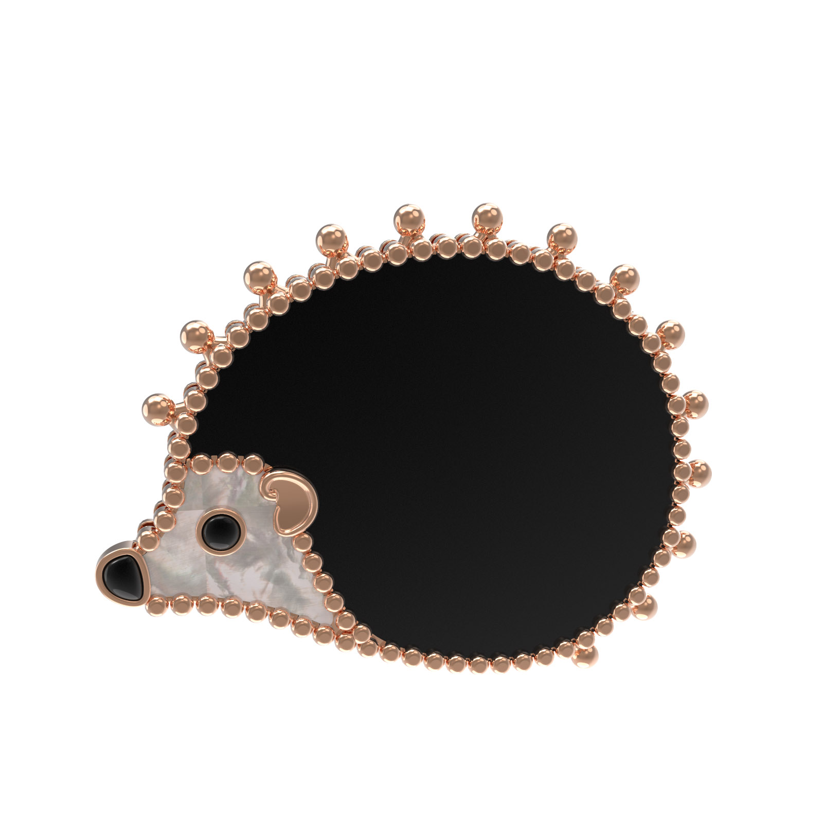 Центральную часть композиции занимает изысканная черная эмаль, контрастирующая с нежным перламутром. Вставка из глубокого оникса добавляет глубины и выразительности взгляду этого необычного ювелирного ежика. Такое сочетание фактур и цветов делает брошь самодостаточным украшением, которое привлекает внимание своей проработкой деталей.