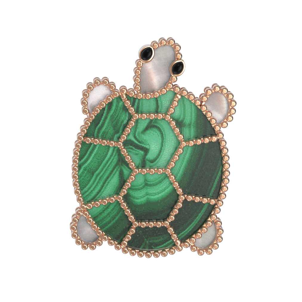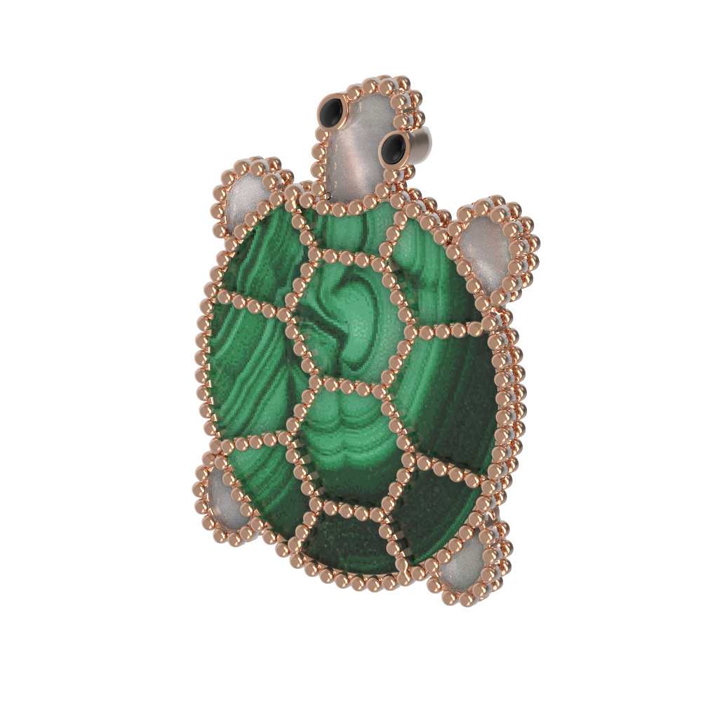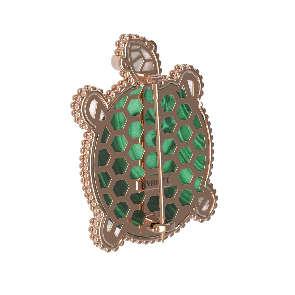 Центральным элементом изделия стал природный малахит глубокого зелёного цвета, который создает эффектный контраст с тёплым оттенком красного золота. Вставки из перламутра добавляют броши мягкое сияние и утонченность, делая украшение гармоничным и привлекающим внимание. Использование одной вставки высокого качества подчеркивает лаконичность и статусность изделия.
