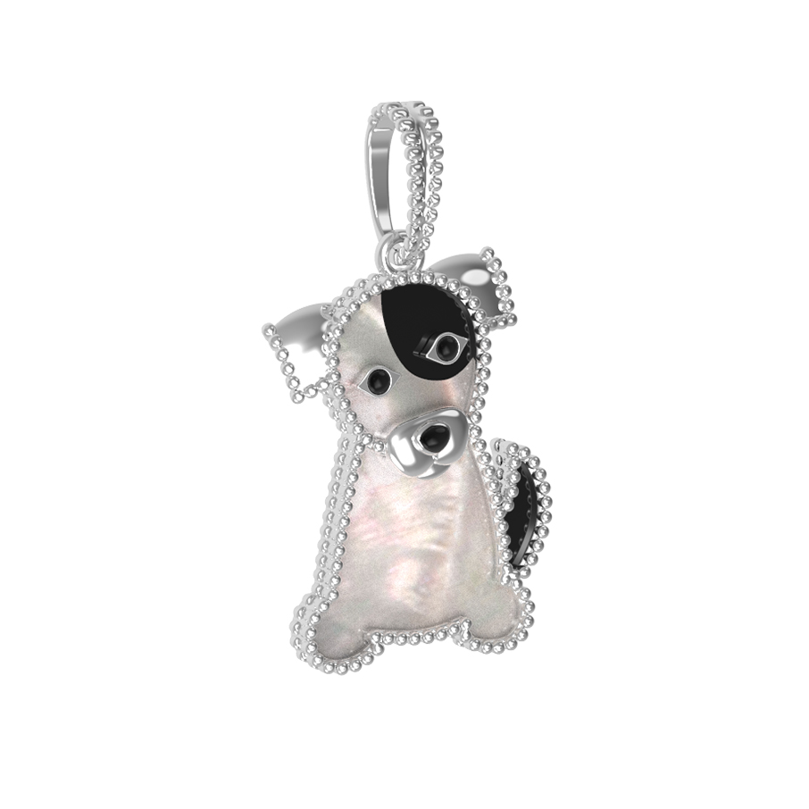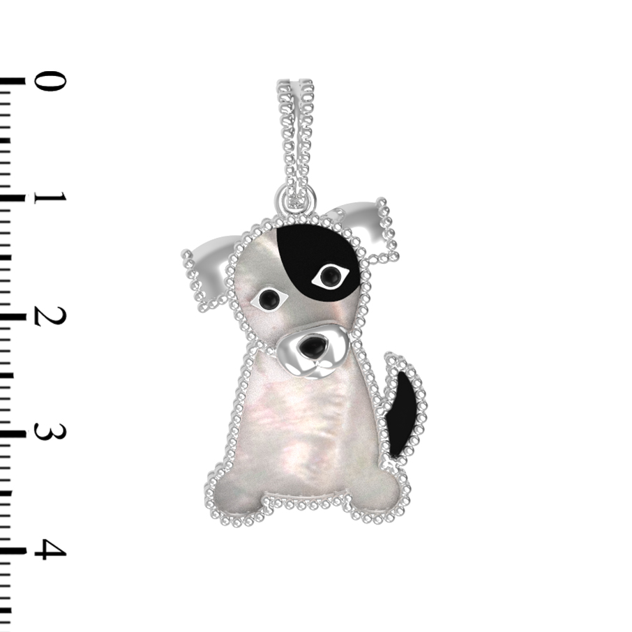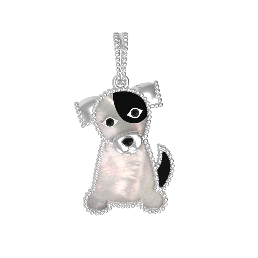 В центре композиции — сочетание благородных материалов и текстур. Мастерство исполнения подчеркивается использованием вставок: классического черного оникса и нежного перламутра, которые вместе создают эффектный контраст. Две вставки, ограненные в форме маркиз, добавляют изделию выразительности. Особый шарм придает ювелирная эмаль, с помощью которой прорисованы детали образа собаки, делая ее облик живым и запоминающимся.
