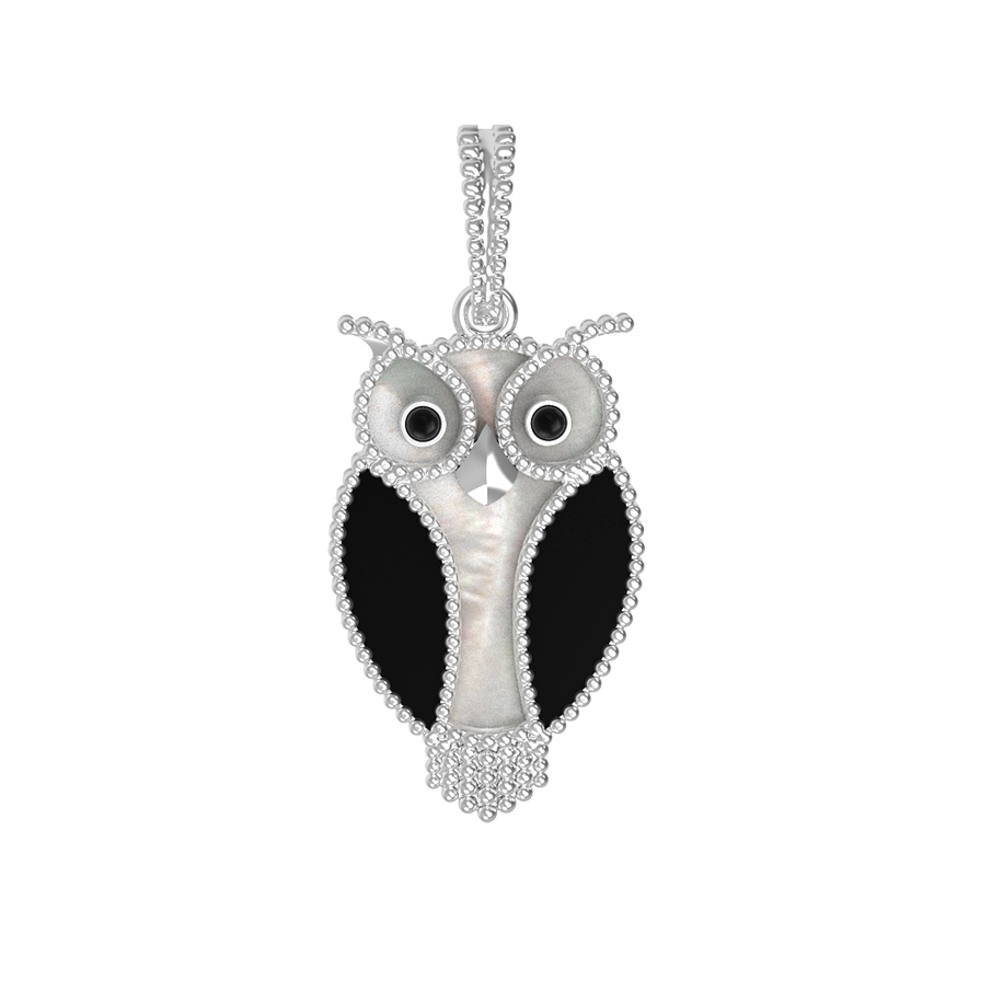 Мастерское сочетание материалов придает подвеске особый шарм: корпус совы декорирован нежным перламутром и благородным черным ониксом, что создает эффектный контраст. Эмаль добавляет украшению выразительности и четкости линий. В дизайне гармонично использованы 2 вставки формы маркиз, которые притягивают взгляд своим глубоким цветом: перламутровым и черным.