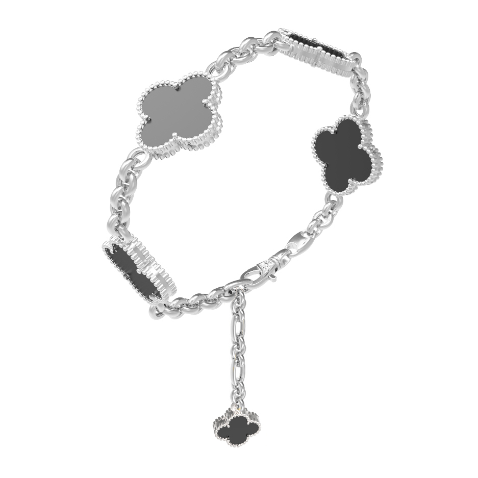 Элегантный и лаконичный браслет из белого золота 585 пробы станет утонченным акцентом вашего образа. Дизайн украшения, вдохновленный эстетикой клевера, воплощает в себе гармонию строгих линий и благородных материалов. Холодный блеск белого золота идеально сочетается с глубоким цветом вставок: пять изящных элементов в форме клевера дополнены выразительным черным ониксом. Этот контраст создает запоминающийся облик, который подчеркнет безупречный вкус владельца.