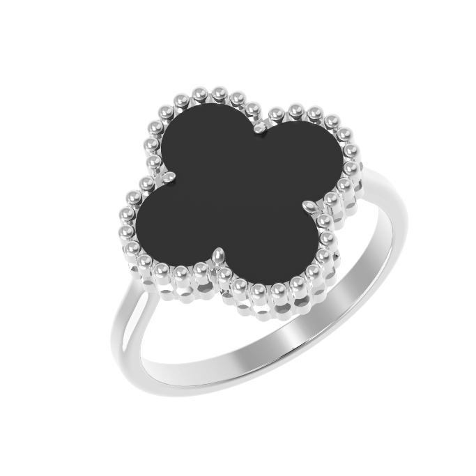 Элегантное кольцо из белого золота 585 пробы — это воплощение лаконичной роскоши и безупречного стиля. Ювелирное изделие выполнено в популярном дизайне «Клевер», который давно стал классикой ювелирного искусства. В центре композиции находится одна крупная вставка из оникса глубокого черного цвета, чья строгость и насыщенность идеально подчеркивают холодный блеск благородного металла.