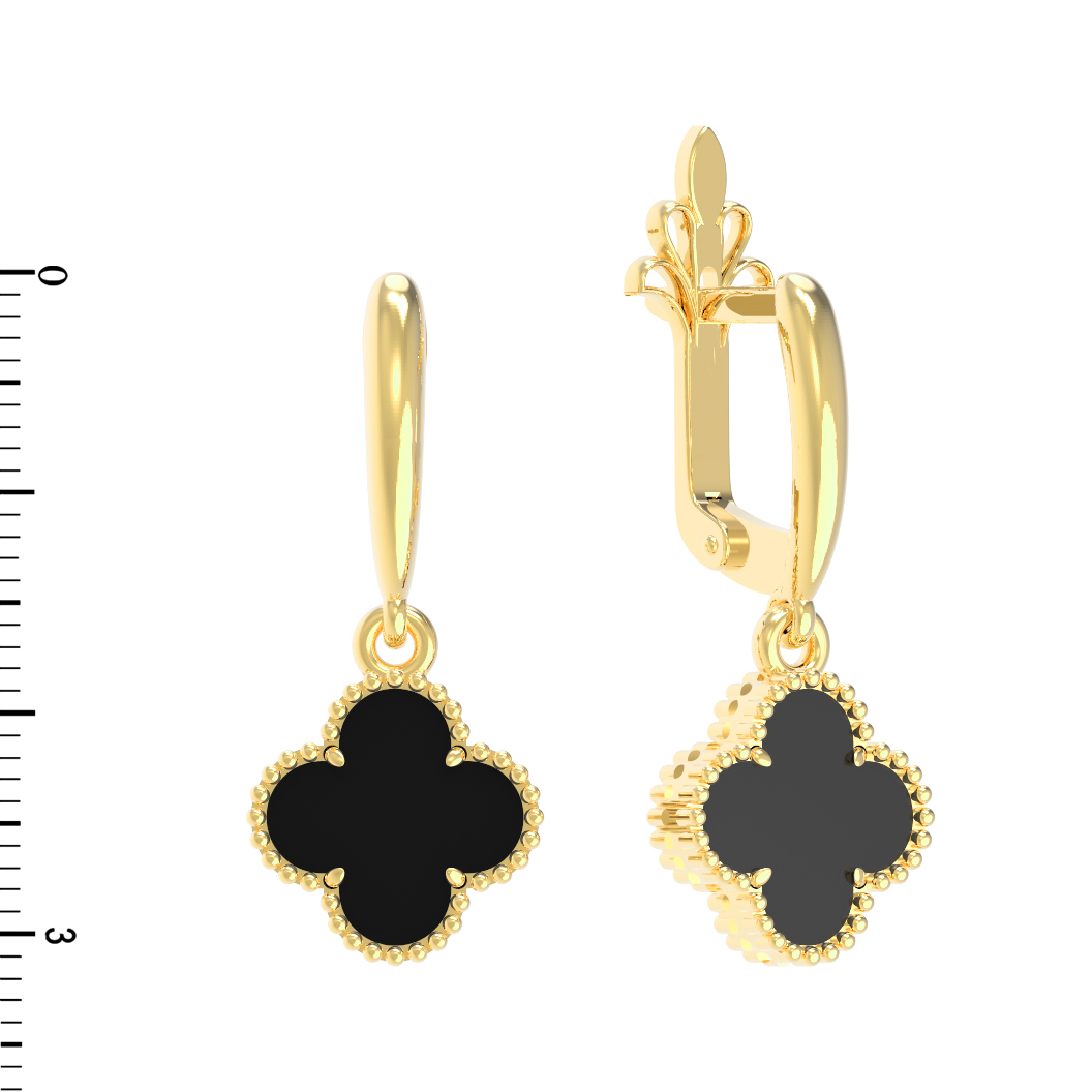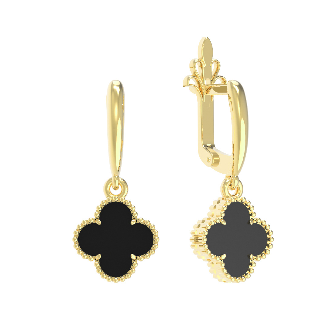 Серьги из коллекции De Luxe — Клевер — это воплощение утонченной элегантности и безупречного стиля. Ювелирное украшение выполнено из благородного лимонного золота 585 пробы, чей теплый и сияющий оттенок идеально подчеркивает глубину вставок. Дизайн модели вдохновлен классическим образом клевера, который неизменно ассоциируется с удачей и гармонией. В центре каждой подвески расположена эффектная вставка из оникса черного цвета, создающая изысканный контраст с золотой оправой.