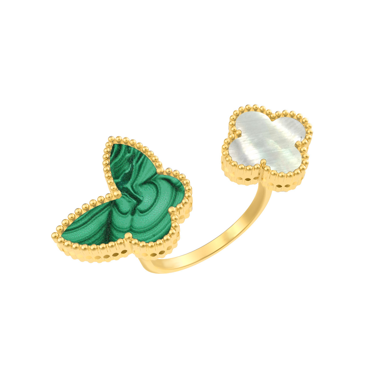 Главным украшением кольца стали контрастные вставки: насыщенный зелёный малахит с его природным уникальным рисунком и нежный переливающийся перламутр. Сочетание этих материалов создает выразительную композицию, которая притягивает взгляды. Изделие выполнено в лимонном цвете золота, который идеально гармонирует с натуральными камнями, придавая аксессуару благородное сияние.