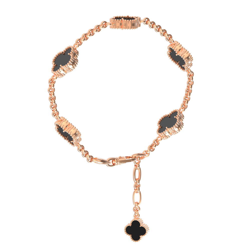 Элегантный браслет из красного золота 585 пробы станет утонченным акцентом вашего образа. Дизайн украшения, вдохновленный символикой клевера, сочетает в себе классические ювелирные традиции и современную лаконичность. Центральным элементом композиции выступает гармоничное сочетание драгоценного металла теплого оттенка и глубокого черного цвета вставок. Шесть вставок из оникса, расположенных по всей длине изделия, создают выразительный контраст с красным золотом, подчеркивая статусность и изысканный вкус обладателя.