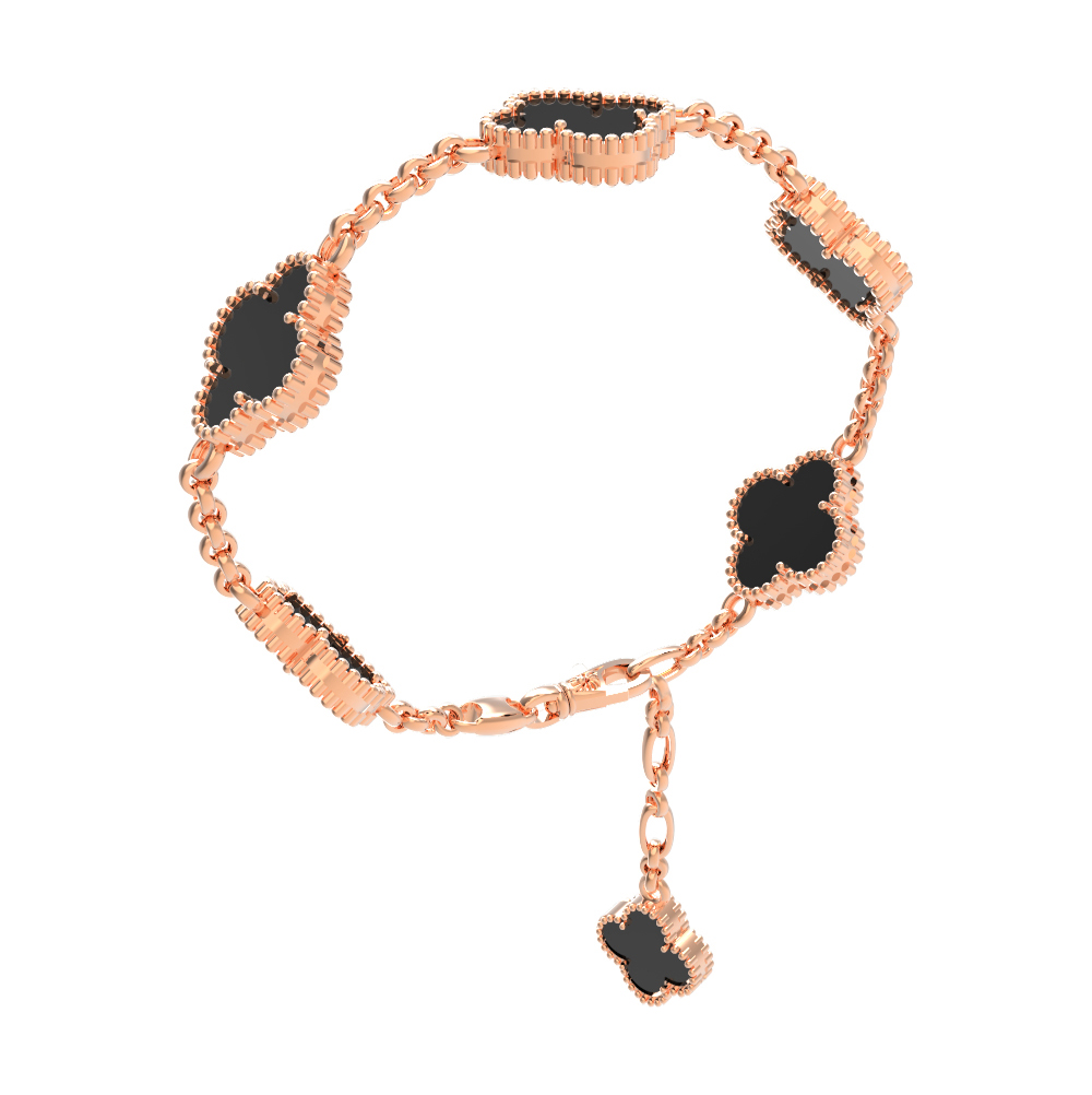 Изысканный браслет из коллекции De Luxe — Клевер — это воплощение элегантности, способное подчеркнуть утонченный вкус своего владельца. Украшение выполнено из красного золота 585 пробы, чей теплый оттенок гармонично сочетается с глубоким цветом вставок. Главным декоративным элементом служит классический дизайн в форме четырехлистного клевера, который неизменно ассоциируется с удачей и благополучием. В этой модели акцент сделан на контраст: благородный блеск металла дополняют 6 вставок из натурального оникса глубокого черного цвета.