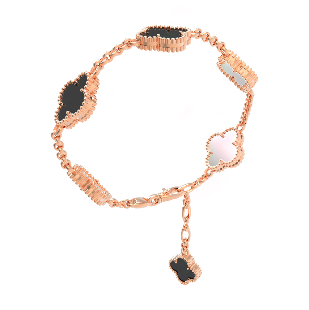 Центральным элементом дизайна являются шесть вставок, выполненных из оникса черного цвета и нежного перламутра. Чередование глубокого темного оникса и переливающегося перламутра придает браслету особую выразительность и глубину. Тщательная проработка деталей делает это украшение универсальным: лаконичный стиль позволяет сочетать его как с повседневными образами, так и с вечерними нарядами.