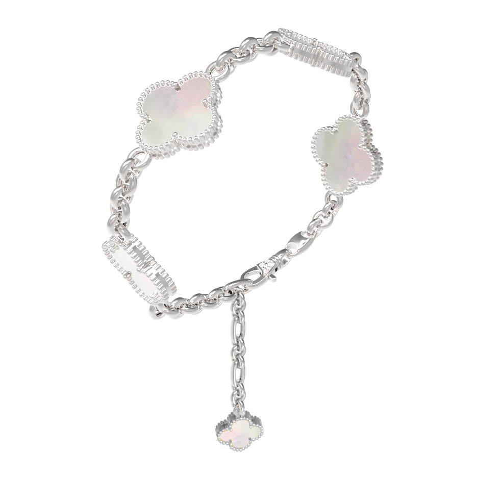 В центре композиции находится натуральный перламутр, чей мягкий перелив эффектно контрастирует с холодным оттенком белого золота. Благодаря универсальной стилистике, этот браслет подойдет как для женщин, так и для мужчин, предпочитающих подчеркнуть свою индивидуальность качественными ювелирными аксессуарами. Продуманная конструкция цепочки обеспечивает комфортную посадку на запястье и надежность при повседневном ношении.